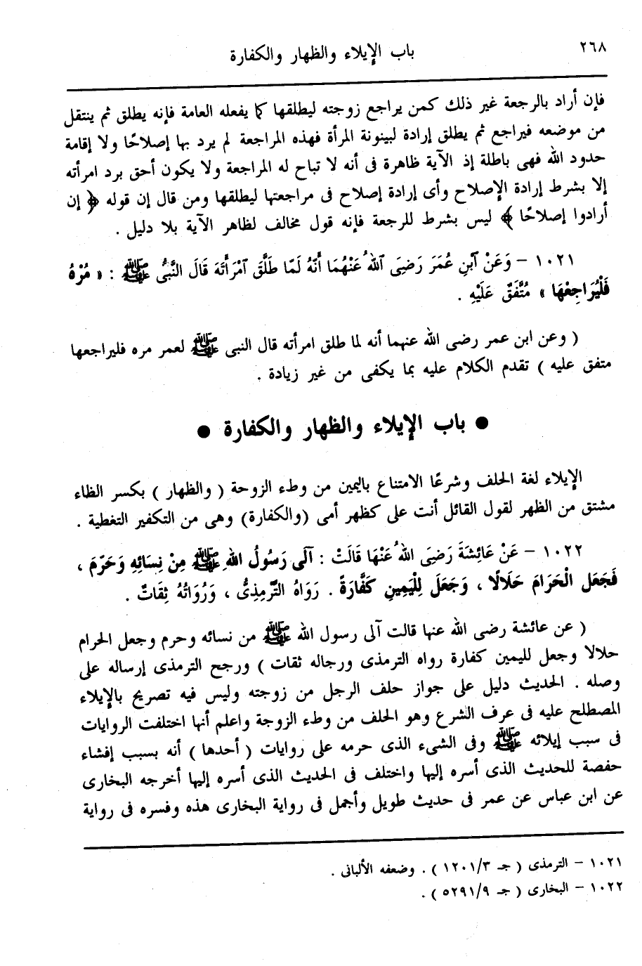 (1022) - عَنْ عَائِشَةَ - رَضِيَ اللَّهُ عَنْهَا - قَالَتْ: «آلَى رَسُولُ اللَّهِ - صَلَّى اللَّهُ عَلَيْهِ وَسَلَّمَ - مِنْ نِسَائِهِ وَحَرَّمَ، فَجَعَلَ الْحَرَامَ حَلَالًا، وَجَعَلَ لِلْيَمِينِ كَفَّارَةً» رَوَاهُ التِّرْمِذِيُّ، وَرُوَاتُهُ ثِقَاتٌ.