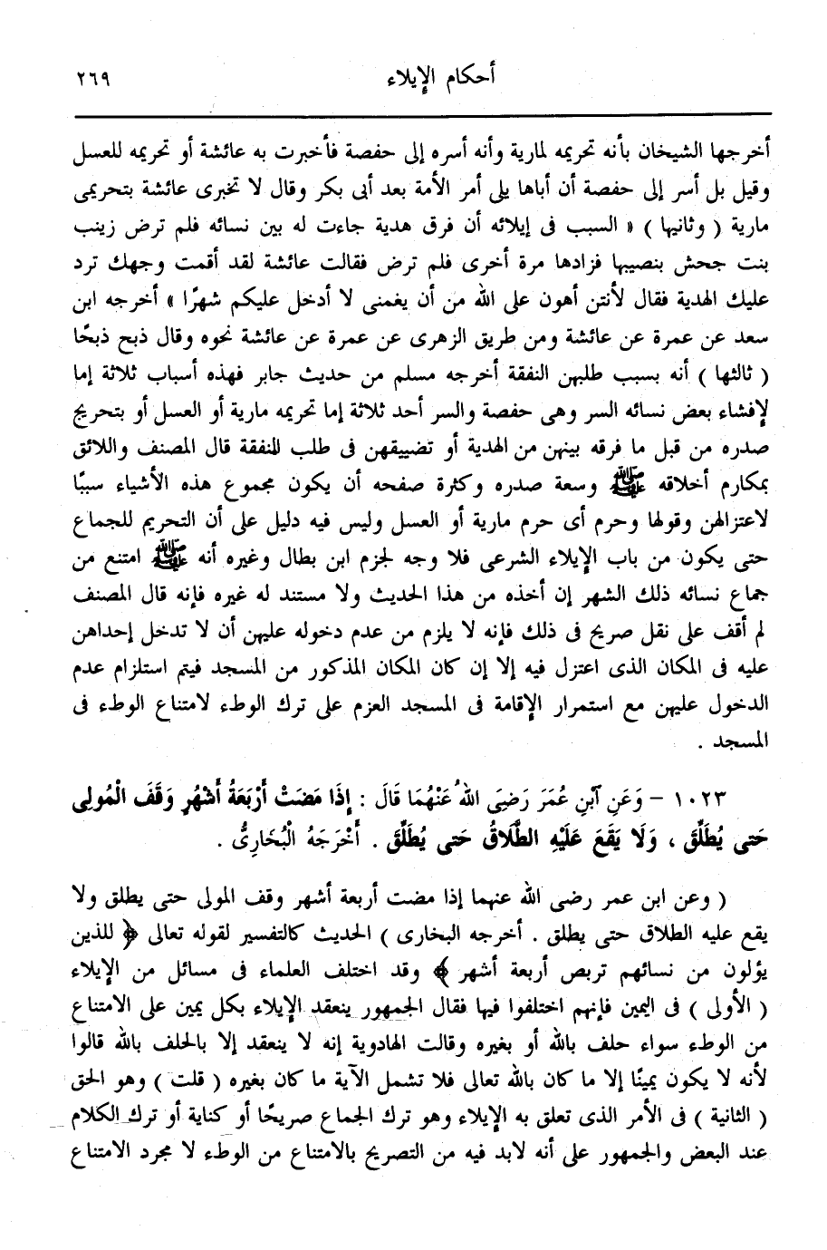 (1023) - وَعَنْ ابْنِ عُمَرَ - رَضِيَ اللَّهُ عَنْهُمَا - قَالَ: إذَا مَضَتْ أَرْبَعَةُ أَشْهُرٍ وَقَفَ الْمُولِي حَتَّى يُطَلِّقَ، وَلَا يَقَعُ عَلَيْهِ الطَّلَاقُ حَتَّى يُطَلِّقَ أَخْرَجَهُ الْبُخَارِيُّ