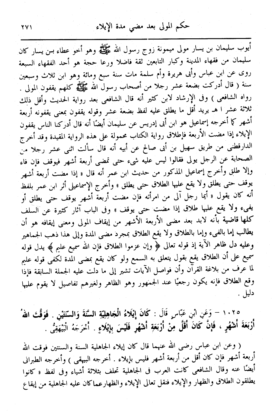 (1025) - وَعَنْ ابْنِ عَبَّاسٍ قَالَ: كَانَ إيلَاءُ الْجَاهِلِيَّةِ السَّنَةَ وَالسَّنَتَيْنِ فَوَقَّتَ اللَّهُ أَرْبَعَةَ أَشْهُرٍ، فَإِنْ كَانَ أَقَلَّ مِنْ أَرْبَعَةِ أَشْهُرٍ فَلَيْسَ بِإِيلَاءٍ أَخْرَجَهُ الْبَيْهَقِيُّ.