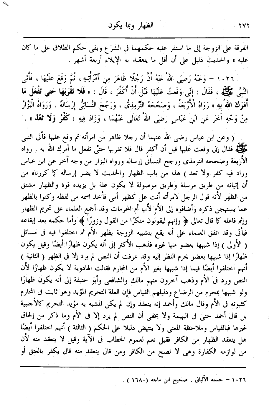 (1026) - وَعَنْهُ «- رَضِيَ اللَّهُ عَنْهُ - أَنَّ رَجُلًا ظَاهَرَ مِنْ امْرَأَتِهِ، ثُمَّ وَقَعَ عَلَيْهَا، فَأَتَى النَّبِيَّ - صَلَّى اللَّهُ عَلَيْهِ وَسَلَّمَ -، فَقَالَ: إنِّي وَقَعْت عَلَيْهَا قَبْلَ أَنْ أُكَفِّرَ، قَالَ: فَلَا تَقْرَبْهَا حَتَّى تَفْعَلَ مَا أَمَرَك اللَّهُ بِهِ» رَوَاهُ الْأَرْبَعَةُ، وَصَحَّحَهُ التِّرْمِذِيُّ، وَرَجَّحَ النَّسَائِيّ إرْسَالَهُ وَرَوَاهُ الْبَزَّارُ مِنْ وَجْهٍ آخَرَ عَنْ ابْنِ عَبَّاسٍ - رَضِيَ اللَّهُ تَعَالَى عَنْهُمَا -، وَزَادَ فِيهِ " كَفِّرْ، وَلَا تَعُدْ ".