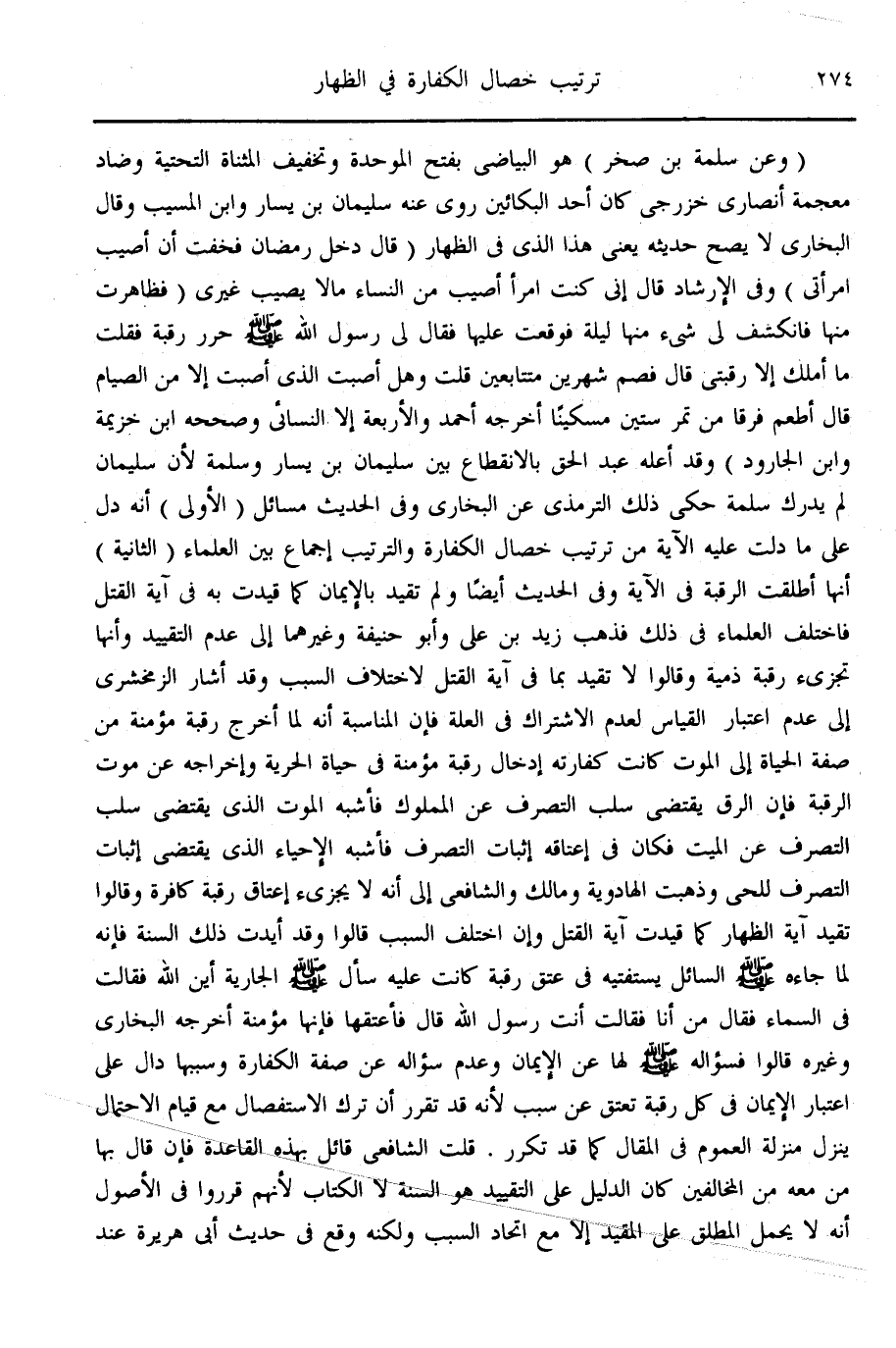 وَعَنْ سَلَمَةَ بْنِ صَخْرٍ) هُوَ الْبَيَاضِيُّ بِفَتْحِ الْمُوَحَّدَةِ وَتَخْفِيفِ الْمُثَنَّاةِ التَّحْتِيَّةِ وَضَادٍ مُعْجَمَةٍ أَنْصَارِيٌّ خَزْرَجِيٌّ كَانَ أَحَدَ الْبَكَّائِينَ رَوَى عَنْهُ سُلَيْمَانُ بْنُ يَسَارٍ وَابْنُ الْمُسَيِّبِ، وَقَالَ الْبُخَارِيُّ لَا يَصِحُّ حَدِيثُهُ يَعْنِي هَذَا الَّذِي فِي الظِّهَارِ (قَالَ «دَخَلَ رَمَضَانُ فَخِفْت أَنْ أُصِيبَ امْرَأَتِي» . وَفِي الْإِرْشَادِ قَالَ «إنِّي كُنْت امْرَأً أُصِيبُ مِنْ النِّسَاءِ مَا لَا يُصِيبُ غَيْرِي فَظَاهَرْت مِنْهَا فَانْكَشَفَ لِي شَيْءٌ مِنْهَا لَيْلَةً فَوَقَعْت عَلَيْهَا، فَقَالَ لِي رَسُولُ اللَّهِ - صَلَّى اللَّهُ عَلَيْهِ وَسَلَّمَ - حَرِّرْ رَقَبَةً فَقُلْت مَا أَمْلِكُ إلَّا رَقَبَتِي قَالَ فَصُمْ شَهْرَيْنِ مُتَتَابِعَيْنِ قُلْت وَهَلْ أَصَبْت الَّذِي أَصَبْت إلَّا مِنْ الصِّيَامِ قَالَ أَطْعِمْ فَرَقًا مِنْ تَمْرٍ سِتِّينَ مِسْكِينًا» أَخْرَجَهُ أَحْمَدُ وَالْأَرْبَعَةُ إلَّا النَّسَائِيّ وَصَحَّحَهُ ابْنُ خُزَيْمَةَ وَابْنُ الْجَارُودِ) ، وَقَدْ أَعَلَّهُ عَبْدُ الْحَقِّ بِالِانْقِطَاعِ بَيْنَ سُلَيْمَانَ بْنِ يَسَارٍ وَسَلَمَةَ؛ لِأَنَّ سُلَيْمَانَ لَمْ يُدْرِكْ سَلَمَةُ حَكَى ذَلِكَ التِّرْمِذِيُّ عَنْ الْبُخَارِيِّ.