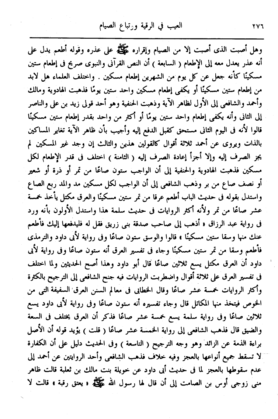 وَفِي رِوَايَةٍ لِأَبِي دَاوُد وَالتِّرْمِذِيُّ «فَأَطْعِمْ وَسْقًا مِنْ تَمْرٍ سِتِّينَ مِسْكِينًا» وَجَاءَ فِي تَفْسِيرِ الْعَرَقِ أَنَّهُ سِتُّونَ صَاعًا. وَفِي رِوَايَةٍ لِأَبِي دَاوُد أَنَّ الْعَرَقَ مِكْتَلٌ يَسَعُ ثَلَاثِينَ صَاعًا قَالَ أَبُو دَاوُد، وَهَذَا أَصَحُّ الْحَدِيثَيْنِ وَلَمَّا اُخْتُلِفَ فِي تَفْسِيرِ الْعَرَقِ عَلَى ثَلَاثَةِ أَقْوَالٍ وَاضْطَرَبَتْ الرِّوَايَاتُ فِيهِ جَنَحَ الشَّافِعِيُّ إلَى التَّرْجِيحِ بِالْكَثْرَةِ وَأَكْثَرُ الرِّوَايَاتِ خَمْسَةَ عَشَرَ صَاعًا، وَقَالَ الْخَطَّابِيُّ فِي مَعَالِمِ السُّنَنِ الْعَرَقُ السَّفِيفَةُ الَّتِي مِنْ الْخُوصِ فَيُتَّخَذُ مِنْهَا الْمَكَاتِلُ قَالَ وَجَاءَ تَفْسِيرُهُ أَنَّهُ سِتُّونَ صَاعًا. وَفِي رِوَايَةٍ لِأَبِي دَاوُد يَسَعُ ثَلَاثِينَ صَاعًا. وَفِي رِوَايَةِ سَلَمَةَ يَسَعُ خَمْسَةَ عَشَرَ صَاعًا