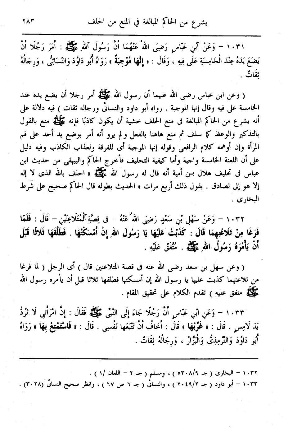 (1031) - وَعَنْ ابْنِ عَبَّاسٍ - رَضِيَ اللَّهُ عَنْهُمَا - «أَنَّ رَسُولَ اللَّهِ - صَلَّى اللَّهُ عَلَيْهِ وَسَلَّمَ -: أَمَرَ رَجُلًا أَنْ يَضَعَ يَدَهُ عِنْدَ الْخَامِسَةِ عَلَى فِيهِ، وَقَالَ: إنَّهَا مُوجِبَةٌ» رَوَاهُ أَبُو دَاوُد وَالنَّسَائِيُّ، وَرِجَالُهُ ثِقَاتٌ