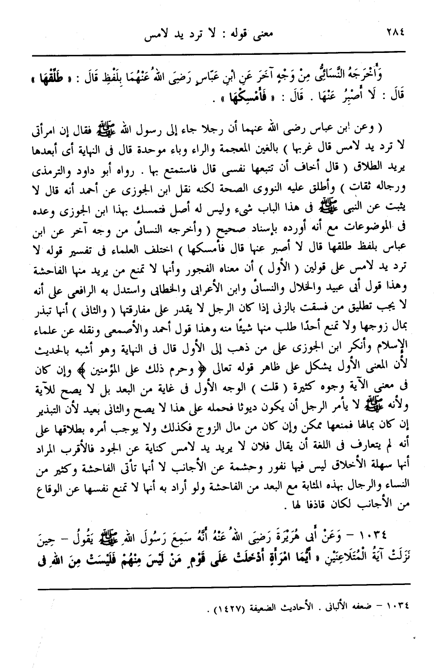 ـــــــــــــــــــــــــــــQ (وَعَنْ ابْنِ عَبَّاسٍ - رَضِيَ اللَّهُ عَنْهُمَا - «أَنَّ رَجُلًا جَاءَ إلَى رَسُولِ اللَّهِ - صَلَّى اللَّهُ عَلَيْهِ وَسَلَّمَ -، فَقَالَ إنَّ امْرَأَتِي لَا تَرُدُّ يَدَ لَامِسٍ قَالَ غَرِّبْهَا» بِالْغَيْنِ الْمُعْجَمَةِ وَالرَّاءِ وَبَاءٍ مُوَحَّدَةٍ قَالَ فِي النِّهَايَةِ أَيْ أَبْعِدْهَا يُرِيدُ الطَّلَاقَ «قَالَ أَخَافُ أَنْ تَتْبَعَهَا نَفْسِي قَالَ فَاسْتَمْتِعْ بِهَا» . رَوَاهُ أَبُو دَاوُد وَالتِّرْمِذِيُّ وَرِجَالُهُ ثِقَاتٌ) وَأَطْلَقَ عَلَيْهِ النَّوَوِيُّ الصِّحَّةَ لَكِنَّهُ نَقَلَ ابْنُ الْجَوْزِيِّ عَنْ أَحْمَدَ أَنَّهُ قَالَ لَا يَثْبُتُ عَنْ النَّبِيِّ - صَلَّى اللَّهُ عَلَيْهِ وَسَلَّمَ - فِي هَذَا الْبَابِ شَيْءٌ وَلَيْسَ لَهُ أَصْلٌ فَتَمَسَّكَ بِهَذَا ابْنُ الْجَوْزِيِّ وَعَدَّهُ فِي الْمَوْضُوعَاتِ مَعَ أَنَّهُ أَوْرَدَهُ بِإِسْنَادٍ صَحِيحٍ (وَأَخْرَجَهُ النَّسَائِيّ مِنْ وَجْهٍ آخَرَ عَنْ ابْنِ عَبَّاسٍ بِلَفْظِ «طَلِّقْهَا قَالَ لَا أَصْبِرُ عَنْهَا قَالَ فَأَمْسِكْهَا» .