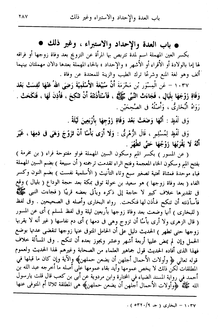 (1037) - عَنْ الْمِسْوَرِ بْنِ مَخْرَمَةَ «أَنَّ سُبَيْعَةَ الْأَسْلَمِيَّةَ - رَضِيَ اللَّهُ عَنْهَا - نُفِسَتْ بَعْدَ وَفَاةِ زَوْجِهَا بِلَيَالٍ، فَجَاءَتْ النَّبِيَّ - صَلَّى اللَّهُ عَلَيْهِ وَسَلَّمَ -، فَاسْتَأْذَنَتْهُ أَنْ تَنْكِحَ، فَأَذِنَ لَهَا، فَنَكَحَتْ» . رَوَاهُ الْبُخَارِيُّ، وَأَصْلُهُ فِي الصَّحِيحَيْنِ. وَفِي لَفْظٍ: «أَنَّهَا وَضَعَتْ بَعْدَ وَفَاةِ زَوْجِهَا بِأَرْبَعِينَ لَيْلَةً» . وَفِي لَفْظٍ لِمُسْلِمٍ، قَالَ الزُّهْرِيُّ:، وَلَا أَرَى بَأْسًا أَنْ تُزَوَّجَ وَهِيَ فِي دَمِهَا، غَيْرَ أَنَّهُ لَا يَقْرَبُهَا زَوْجُهَا حَتَّى تَطْهُرَ.