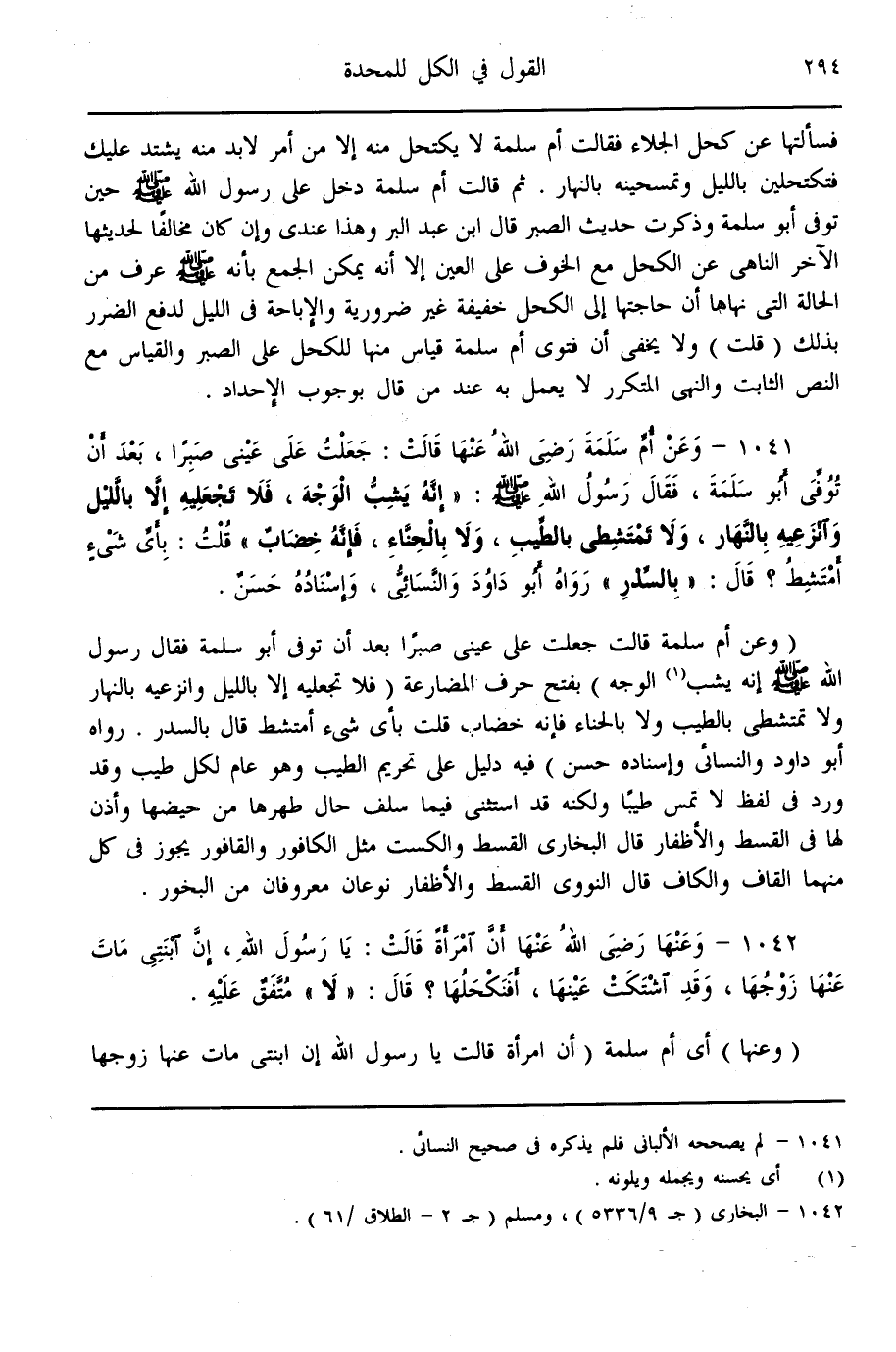 (1042) - وَعَنْهَا - رَضِيَ اللَّهُ عَنْهَا - «أَنَّ امْرَأَةً قَالَتْ: يَا رَسُولَ اللَّهِ، إنَّ ابْنَتِي مَاتَ عَنْهَا زَوْجُهَا، وَقَدْ اشْتَكَتْ عَيْنَهَا، أَفَنَكْحُلُهَا؟ قَالَ: لَا» مُتَّفَقٌ عَلَيْهِ.