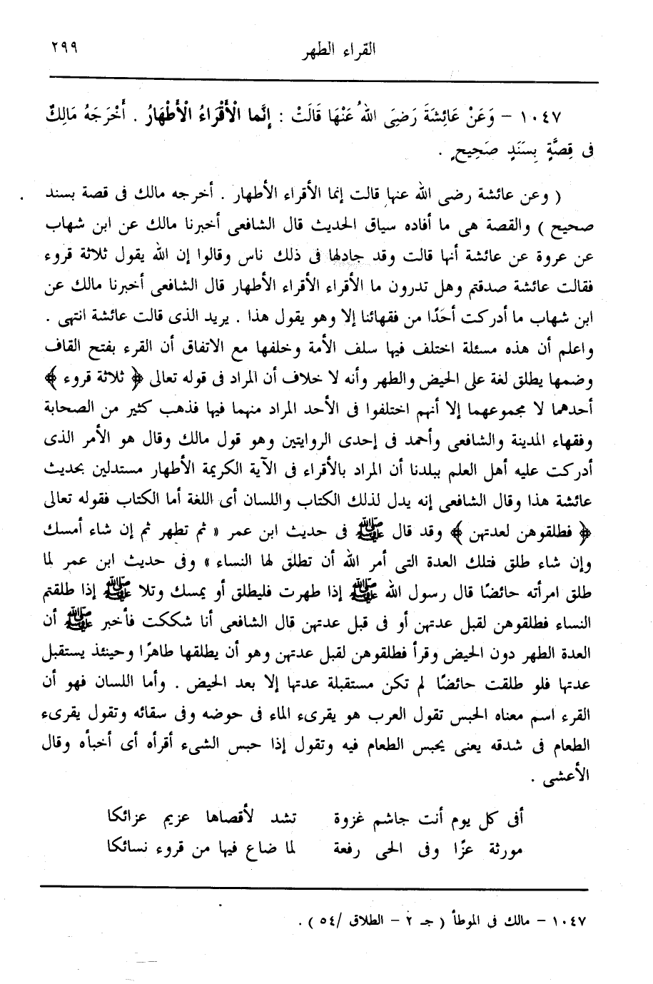 (وَعَنْ عَائِشَةَ - رَضِيَ اللَّهُ عَنْهَا - قَالَتْ إنَّمَا الْأَقْرَاءُ الْأَطْهَارُ. أَخْرَجَهُ مَالِكٌ فِي قِصَّةٍ بِسَنَدٍ صَحِيحٍ) وَالْقِصَّةُ هِيَ مَا أَفَادَهُ سِيَاقُ الْحَدِيثِ قَالَ الشَّافِعِيُّ أَخْبَرَنَا مَالِكٌ عَنْ ابْنِ شِهَابٍ عَنْ عُرْوَةَ عَنْ عَائِشَةَ أَنَّهَا قَالَتْ، وَقَدْ جَادَلَهَا فِي ذَلِكَ نَاسٌ، وَقَالُوا: إنَّ اللَّهَ يَقُولُ: " ثَلَاثَةَ قُرُوءٍ "، فَقَالَتْ عَائِشَةُ صَدَقْتُمْ وَهَلْ تَدْرُونَ مَا الْأَقْرَاءُ؟ الْأَقْرَاءُ الْأَطْهَارُ قَالَ الشَّافِعِيُّ أَخْبَرَنَا مَالِكٌ عَنْ ابْنِ شِهَابٍ مَا أَدْرَكْت أَحَدًا مِنْ فُقَهَائِنَا إلَّا وَهُوَ يَقُولُ هَذَا. يُرِيدُ الَّذِي قَالَتْ عَائِشَةُ انْتَهَى.