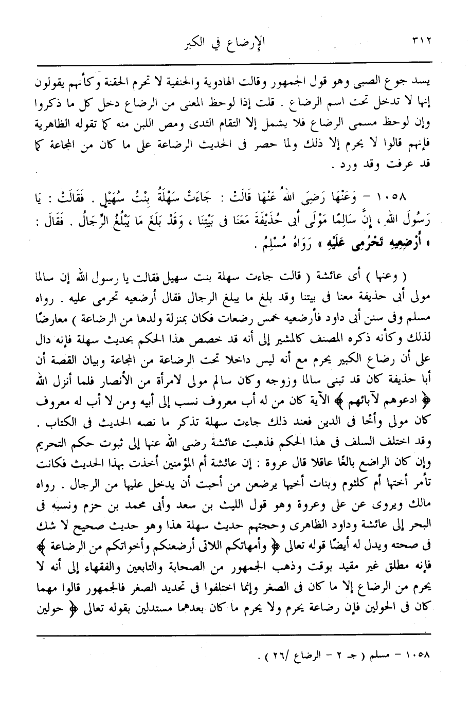 (1058) - وَعَنْهَا - رَضِيَ اللَّهُ عَنْهَا - قَالَتْ: «جَاءَتْ سَهْلَةُ بِنْتُ سُهَيْلٍ، فَقَالَتْ: يَا رَسُولَ اللَّهِ، إنَّ سَالِمًا مَوْلَى أَبِي حُذَيْفَةَ مَعَنَا فِي بَيْتِنَا، وَقَدْ بَلَغَ مَا يَبْلُغُ الرِّجَالُ، فَقَالَ: أَرْضِعِيهِ تَحْرُمِي عَلَيْهِ» رَوَاهُ مُسْلِمٌ.
