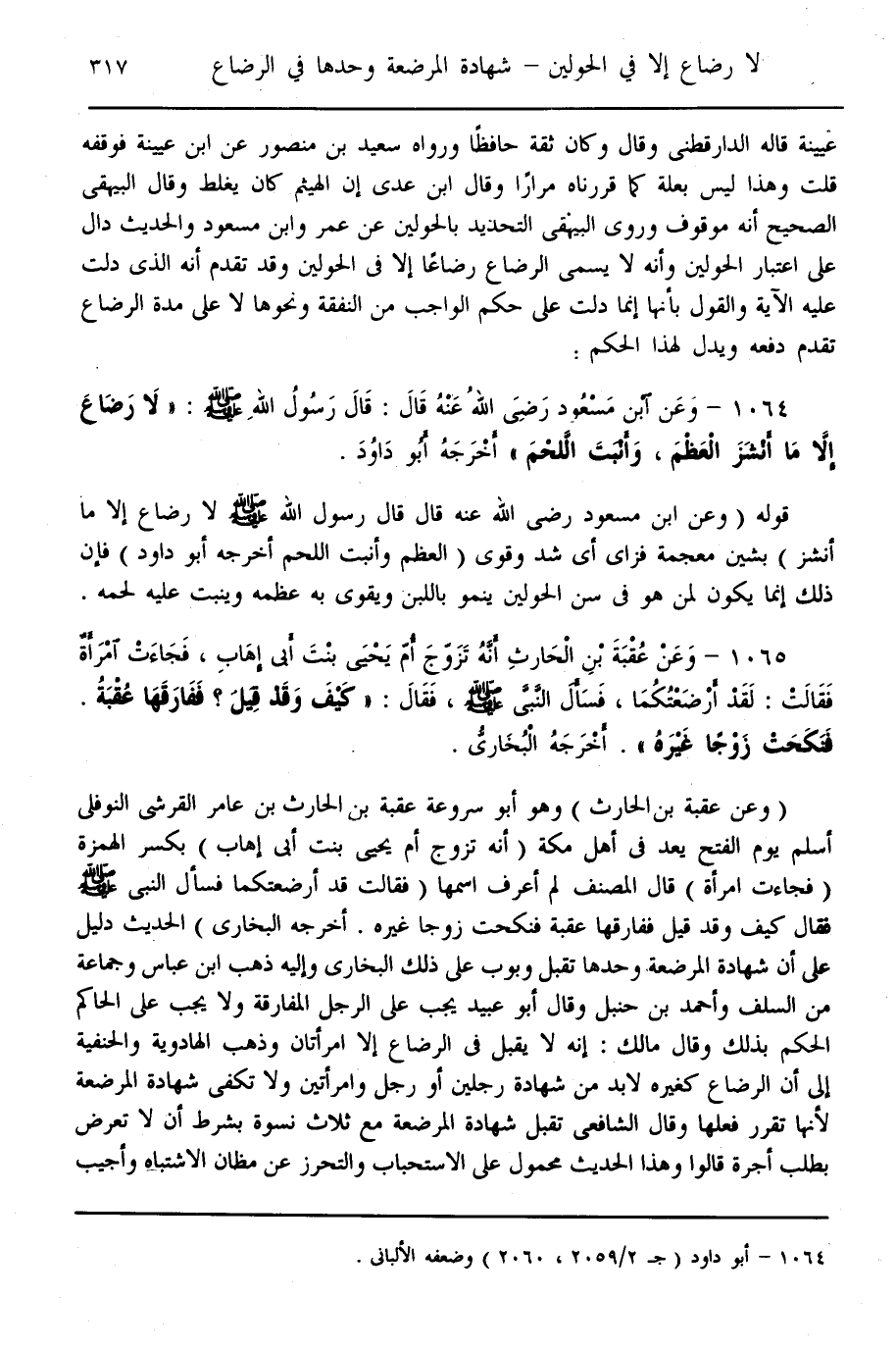 (1065) - «وَعَنْ عُقْبَةَ بْنِ الْحَارِثِ أَنَّهُ تَزَوَّجَ أُمَّ يَحْيَى بِنْتَ أَبِي إهَابٍ، فَجَاءَتْ امْرَأَةٌ، فَقَالَتْ: لَقَدْ أَرْضَعْتُكُمَا، فَسَأَلَ النَّبِيَّ - صَلَّى اللَّهُ عَلَيْهِ وَسَلَّمَ -، فَقَالَ: كَيْفَ، وَقَدْ قِيلَ فَفَارَقَهَا عُقْبَةُ فَنَكَحَتْ زَوْجًا غَيْرَهُ» أَخْرَجَهُ الْبُخَارِيُّ.