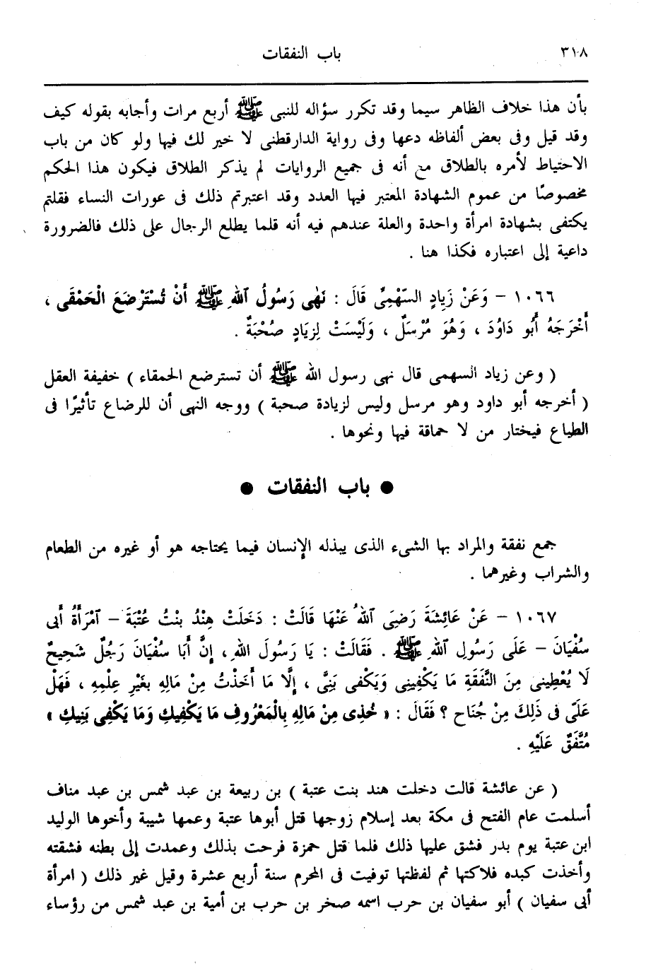(1067) - عَنْ عَائِشَةَ - رَضِيَ اللَّهُ عَنْهَا - قَالَتْ: «دَخَلَتْ هِنْدُ بِنْتُ عُتْبَةَ - امْرَأَةُ أَبِي سُفْيَانَ - عَلَى رَسُولِ اللَّهِ - صَلَّى اللَّهُ عَلَيْهِ وَسَلَّمَ -، فَقَالَتْ: يَا رَسُولَ اللَّهِ، إنَّ أَبَا سُفْيَانَ رَجُلٌ شَحِيحٌ لَا يُعْطِينِي مِنْ النَّفَقَةِ مَا يَكْفِينِي وَيَكْفِي بَنِيَّ، إلَّا مَا أَخَذْت مِنْ مَالِهِ بِغَيْرِ عِلْمِهِ، فَهَلْ عَلَيَّ فِي ذَلِكَ مِنْ جُنَاحٍ؟ فَقَالَ: خُذِي مِنْ مَالِهِ بِالْمَعْرُوفِ مَا يَكْفِيك وَمَا يَكْفِي بَنِيك» مُتَّفَقٌ عَلَيْهِ.