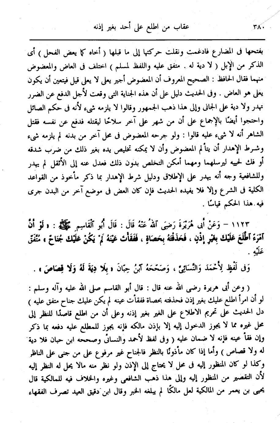 (1123) - وَعَنْ أَبِي هُرَيْرَةَ - رَضِيَ اللَّهُ عَنْهُ - قَالَ: قَالَ أَبُو الْقَاسِمِ - صَلَّى اللَّهُ عَلَيْهِ وَسَلَّمَ -: «لَوْ أَنَّ امْرَأً اطَّلَعَ عَلَيْك بِغَيْرِ إذْنٍ، فَحَذَفْته بِحَصَاةٍ، فَفَقَأْت عَيْنَهُ لَمْ يَكُنْ عَلَيْك جُنَاحٌ» مُتَّفَقٌ عَلَيْهِ. وَفِي لَفْظٍ لِأَحْمَدَ وَالنَّسَائِيُّ، وَصَحَّحَهُ ابْنُ حِبَّانَ " بِلَا دِيَةٍ لَهُ، وَلَا قِصَاصٍ ".