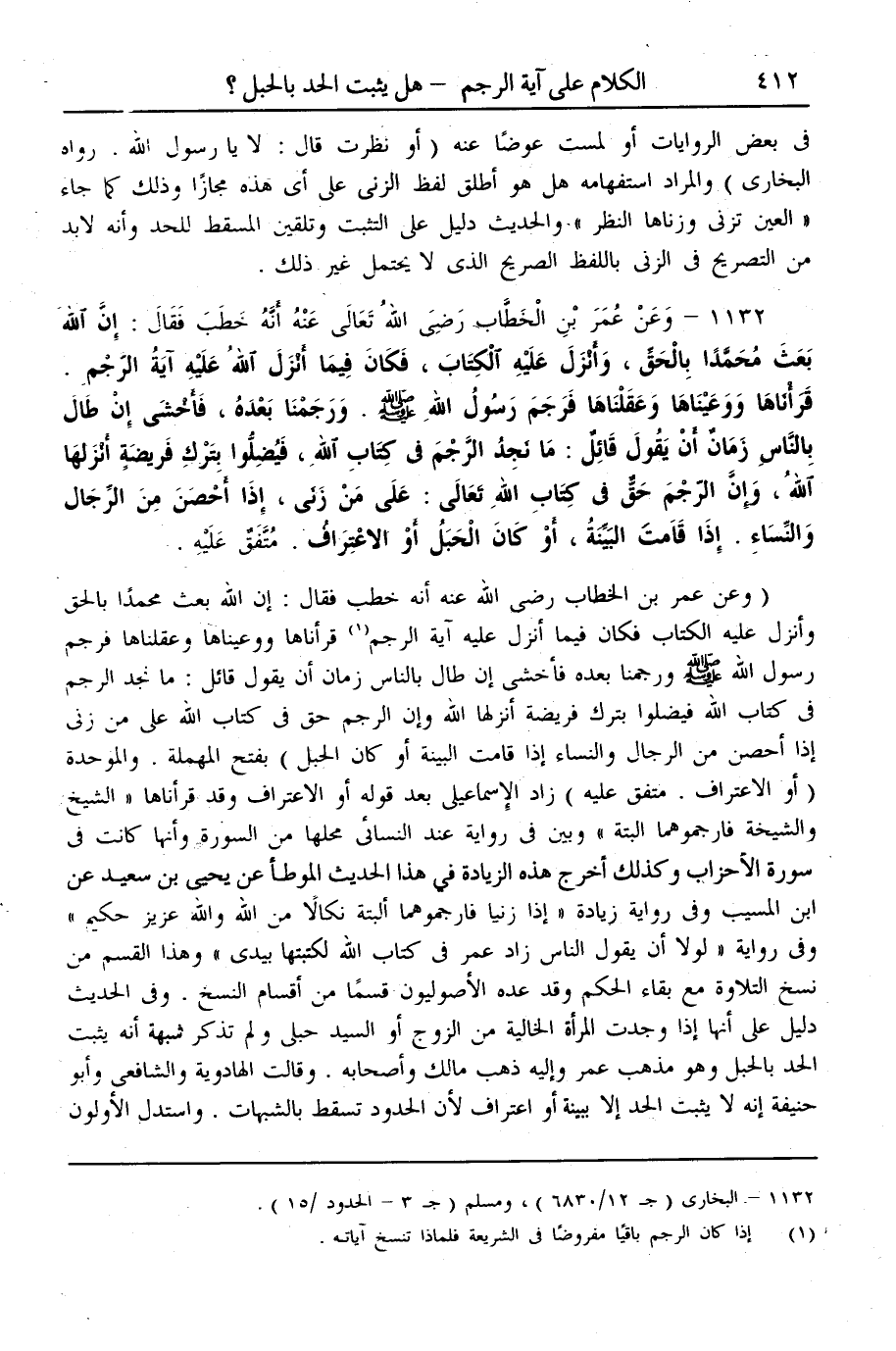 (1132) - وَعَنْ عُمَرَ بْنِ الْخَطَّابِ - رَضِيَ اللَّهُ تَعَالَى عَنْهُ - أَنَّهُ خَطَبَ فَقَالَ: إنَّ اللَّهَ بَعَثَ مُحَمَّدًا بِالْحَقِّ وَأَنْزَلَ عَلَيْهِ الْكِتَابَ، فَكَانَ فِيمَا أَنْزَلَ عَلَيْهِ آيَةُ الرَّجْمِ قَرَأْنَاهَا وَوَعَيْنَاهَا وَعَقَلْنَاهَا فَرَجَمَ رَسُولُ اللَّهِ - صَلَّى اللَّهُ عَلَيْهِ وَسَلَّمَ -. وَرَجَمْنَا بَعْدَهُ، فَأَخْشَى إنْ طَالَ بِالنَّاسِ زَمَانٌ أَنْ يَقُولَ قَائِلٌ: مَا نَجِدُ الرَّجْمَ فِي كِتَابِ اللَّهِ، فَيَضِلُّوا بِتَرْكِ فَرِيضَةٍ أَنْزَلَهَا اللَّهُ، وَإِنَّ الرَّجْمَ حَقٌّ فِي كِتَابِ اللَّهِ تَعَالَى: عَلَى مَنْ زَنَى، إذَا أَحْصَنَ مِنْ الرِّجَالِ وَالنِّسَاءِ. إذَا قَامَتْ الْبَيِّنَةُ أَوْ كَانَ الْحَبَلُ أَوْ الِاعْتِرَافُ مُتَّفَقٌ عَلَيْهِ.