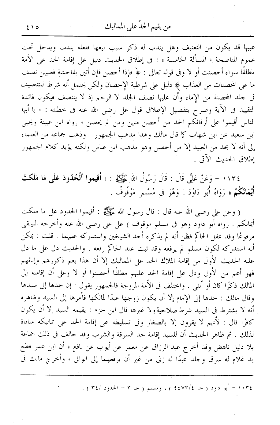 (1134) - وَعَنْ عَلِيٍّ قَالَ: قَالَ رَسُولُ اللَّهِ - صَلَّى اللَّهُ عَلَيْهِ وَسَلَّمَ -: «أَقِيمُوا الْحُدُودَ عَلَى مَا مَلَكَتْ أَيْمَانُكُمْ» رَوَاهُ أَبُو دَاوُد. وَهُوَ فِي مُسْلِمٍ مَوْقُوفٌ