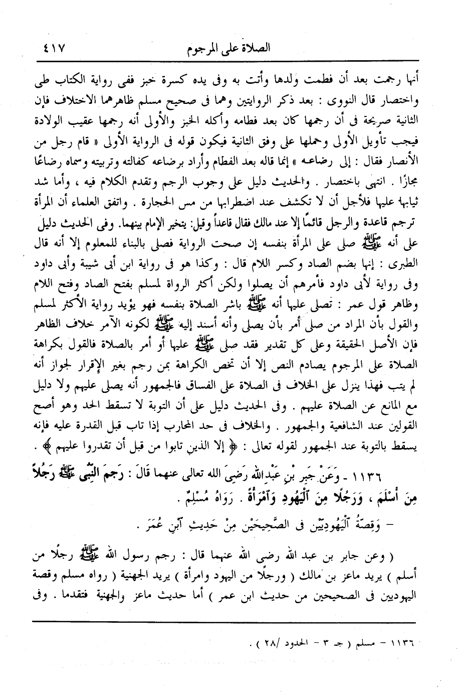 (1136) - وَعَنْ جَابِرِ بْنِ عَبْدِ اللَّهِ - رَضِيَ اللَّهُ عَنْهُمَا - قَالَ: «رَجَمَ النَّبِيُّ - صَلَّى اللَّهُ عَلَيْهِ وَسَلَّمَ - رَجُلًا مِنْ أَسْلَمَ، وَرَجُلًا مِنْ الْيَهُودِ وَامْرَأَةً» رَوَاهُ مُسْلِمٌ - وَقِصَّةُ الْيَهُودِيَّيْنِ فِي الصَّحِيحَيْنِ مِنْ حَدِيثِ ابْنِ عُمَرَ.
