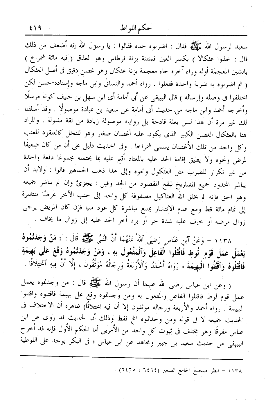 (1138) - وَعَنْ ابْنِ عَبَّاسٍ - رَضِيَ اللَّهُ عَنْهُمَا - أَنَّ النَّبِيَّ - صَلَّى اللَّهُ عَلَيْهِ وَسَلَّمَ - قَالَ: «مَنْ وَجَدْتُمُوهُ يَعْمَلُ عَمَلَ قَوْمِ لُوطٍ فَاقْتُلُوا الْفَاعِلَ وَالْمَفْعُولَ بِهِ، وَمَنْ وَجَدْتُمُوهُ وَقَعَ عَلَى بَهِيمَةٍ فَاقْتُلُوهُ وَاقْتُلُوا الْبَهِيمَةَ» رَوَاهُ أَحْمَدُ وَالْأَرْبَعَةُ وَرِجَالُهُ مُوَثَّقُونَ، إلَّا أَنَّ فِيهِ اخْتِلَافًا.