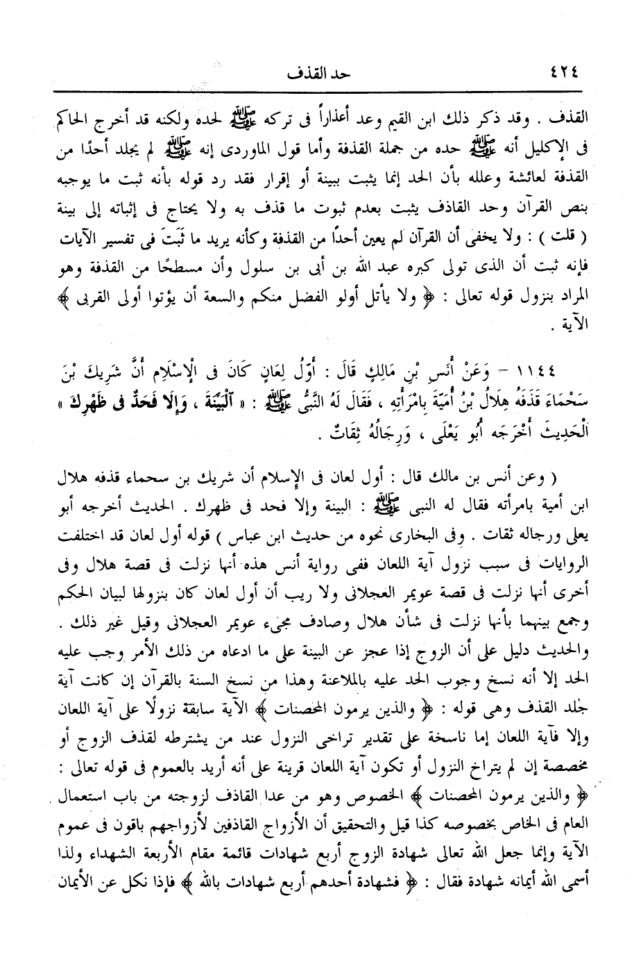 (1144) - وَعَنْ أَنَسِ بْنِ مَالِكٍ قَالَ: أَوَّلُ لِعَانٍ كَانَ فِي الْإِسْلَامِ أَنَّ شَرِيكَ ابْنَ سَحْمَاءَ قَذَفَهُ هِلَالُ بْنُ أُمَيَّةَ بِامْرَأَتِهِ، فَقَالَ لَهُ النَّبِيُّ - صَلَّى اللَّهُ عَلَيْهِ وَسَلَّمَ -: «الْبَيِّنَةَ، وَإِلَّا فَحَدٌّ فِي ظَهْرِك» الْحَدِيثُ أَخْرَجَهُ أَبُو يَعْلَى، وَرِجَالُهُ ثِقَاتٌ