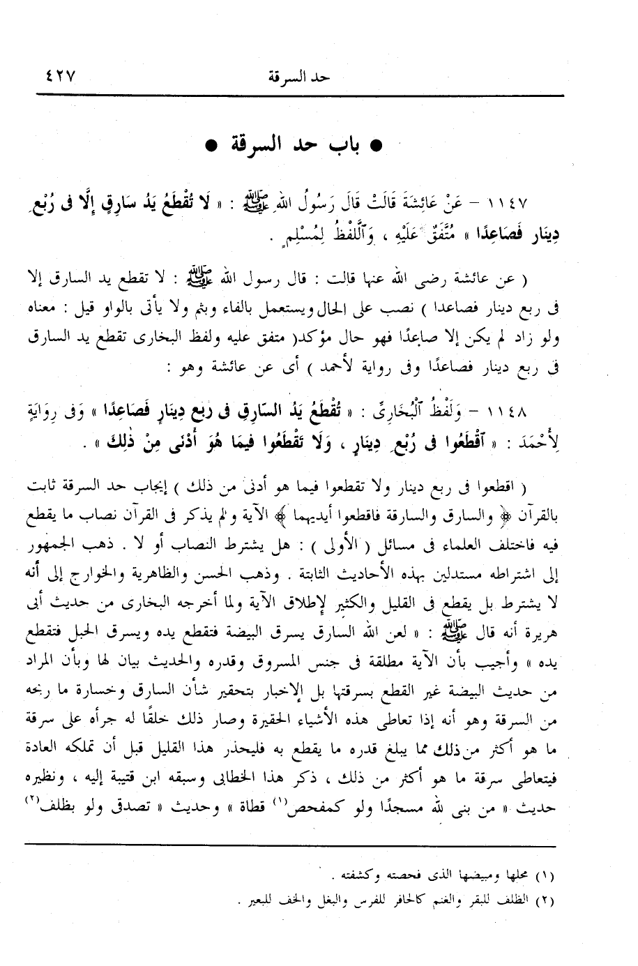 (1148) - وَلَفْظُ الْبُخَارِيِّ: «تُقْطَعُ يَدُ السَّارِقِ فِي رُبُعِ دِينَارٍ فَصَاعِدًا» وَفِي رِوَايَةٍ لِأَحْمَدَ: «اقْطَعُوا فِي رُبُعِ دِينَارٍ، وَلَا تَقْطَعُوا فِيمَا هُوَ أَدْنَى مِنْ ذَلِكَ» .