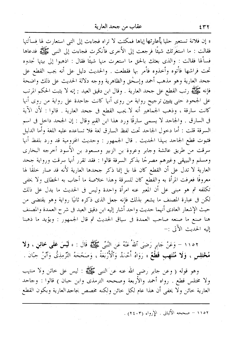 وَهُوَ قَوْلُهُ (وَعَنْ جَابِرٍ - رَضِيَ اللَّهُ عَنْهُ - عَنْ النَّبِيِّ - صَلَّى اللَّهُ عَلَيْهِ وَسَلَّمَ -: «لَيْسَ عَلَى خَائِنٍ وَلَا مُنْتَهِبٍ وَلَا مُخْتَلِسٍ قَطْعٌ» . رَوَاهُ أَحْمَدُ وَالْأَرْبَعَةُ وَصَحَّحَهُ التِّرْمِذِيُّ وَابْنُ حِبَّانَ) قَالُوا: وَجَاحِدُ الْعَارِيَّةِ خَائِنٌ وَلَا يَخْفَى أَنَّ هَذَا عَامٌّ لِكُلِّ خَائِنٍ وَلَكِنَّهُ مُخَصَّصٌ بِجَاحِدِ الْعَارِيَّةِ وَبِكَوْنِ الْقَطْعِ
