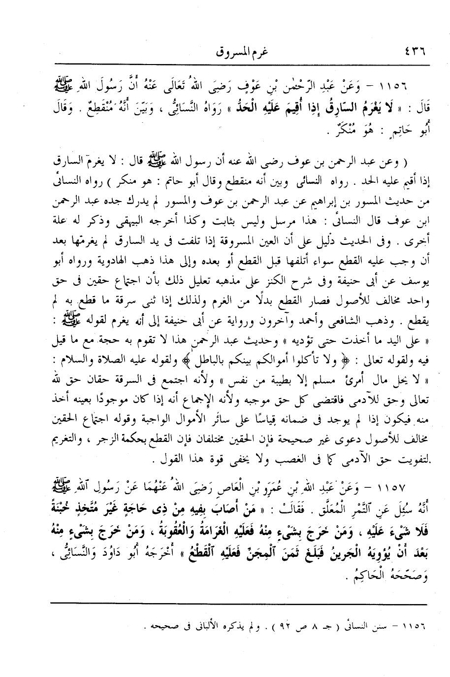 (وَعَنْ عَبْدِ الرَّحْمَنِ بْنِ عَوْفٍ - رَضِيَ اللَّهُ عَنْهُ - أَنَّ رَسُولَ اللَّهِ - صَلَّى اللَّهُ عَلَيْهِ وَسَلَّمَ - قَالَ: «لَا يَغْرَمُ السَّارِقُ إذَا أُقِيمَ عَلَيْهِ الْحَدُّ.» رَوَاهُ النَّسَائِيّ وَبَيَّنَ أَنَّهُ مُنْقَطِعٌ وَقَالَ حَاتِمٌ: هُوَ مُنْكَرٌ) رَوَاهُ النَّسَائِيّ مِنْ حَدِيثِ الْمِسْوَرِ بْنِ إبْرَاهِيمَ عَنْ عَبْدِ الرَّحْمَنِ بْنِ عَوْفٍ وَالْمِسْوَرِ لَمْ يُدْرِكْ جَدَّهُ عَبْدَ الرَّحْمَنِ بْنَ عَوْفٍ قَالَ النَّسَائِيّ: هَذَا مُرْسَلٌ وَلَيْسَ بِثَابِتٍ وَكَذَا أَخْرَجَهُ الْبَيْهَقِيُّ وَذَكَرَ لَهُ عِلَّةً أُخْرَى. وَفِي الْحَدِيثِ دَلِيلٌ عَلَى أَنَّ الْعَيْنَ الْمَسْرُوقَةَ إذَا تَلِفَتْ فِي يَدِ السَّارِقِ لَمْ يَغْرَمْهَا بَعْدَ أَنْ وَجَبَ عَلَيْهِ الْقَطْعُ عَلَيْهِ سَوَاءٌ أَتْلَفَهَا قَبْلَ الْقَطْعِ أَوْ بَعْدَهُ وَإِلَى هَذَا ذَهَبَ الْهَادَوِيَّةُ وَرَوَاهُ أَبُو يُوسُفَ عَنْ أَبِي حَنِيفَةَ وَفِي شَرْحِ الْكَنْزِ عَلَى مَذْهَبِهِ تَعْلِيلُ ذَلِكَ بِأَنَّ اجْتِمَاعَ حَقَّيْنِ فِي حَقٍّ وَاحِدٍ مُخَالِفٌ لِلْأُصُولِ فَصَارَ الْقَطْعُ بَدَلًا مِنْ الْغُرْمِ وَلِذَلِكَ إذَا ثَنَّى سَرِقَةَ مَا قُطِعَ بِهِ لَمْ يُقْطَعْ.