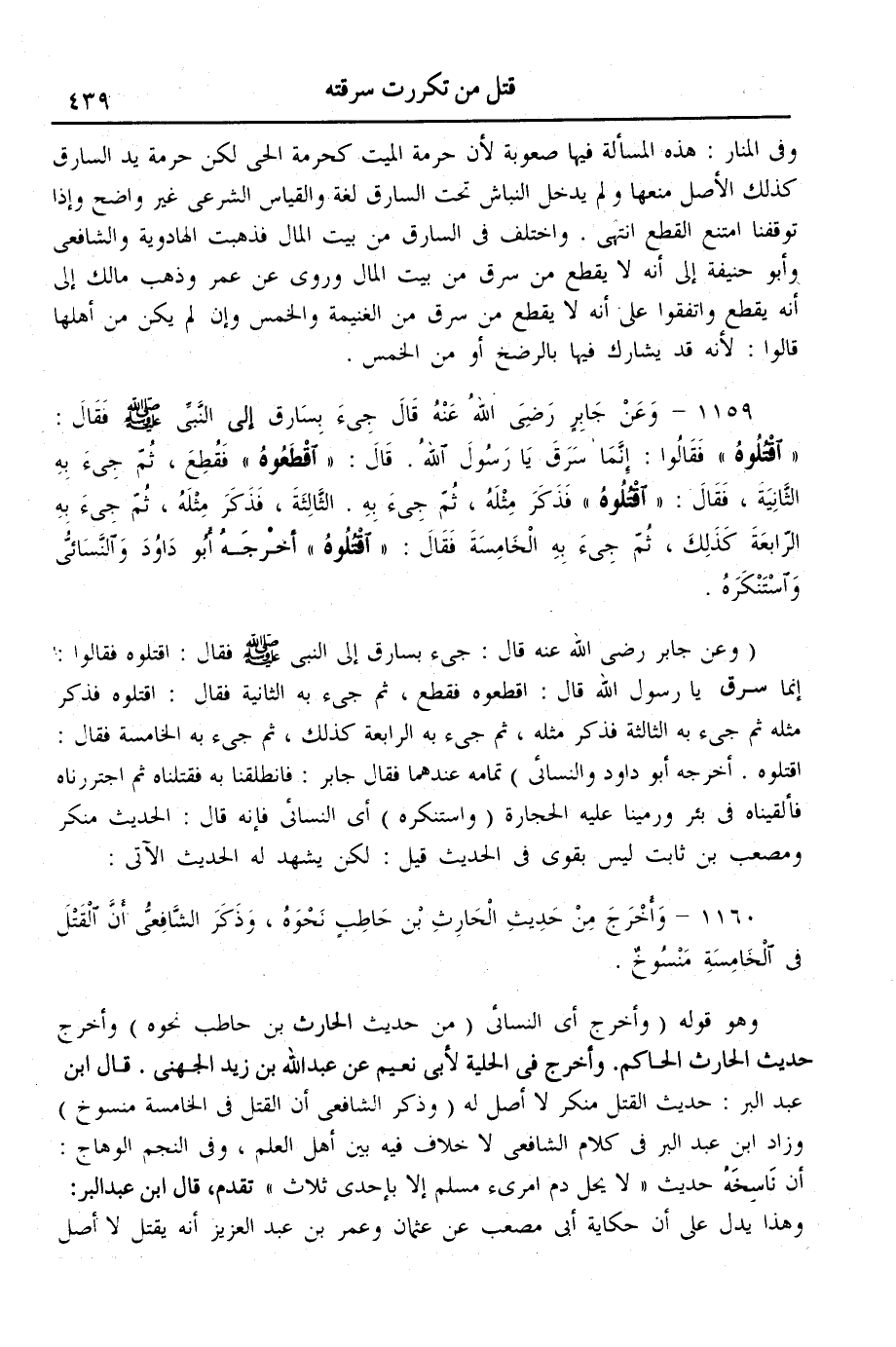 (1159) - وَعَنْ جَابِرٍ - رَضِيَ اللَّهُ عَنْهُ - قَالَ «جِيءَ بِسَارِقٍ إلَى النَّبِيِّ - صَلَّى اللَّهُ عَلَيْهِ وَسَلَّمَ - فَقَالَ: اُقْتُلُوهُ فَقَالُوا: إنَّمَا سَرَقَ يَا رَسُولَ اللَّهِ. قَالَ: اقْطَعُوهُ فَقُطِعَ، ثُمَّ جِيءَ بِهِ الثَّانِيَةَ، فَقَالَ: اُقْتُلُوهُ فَذَكَرَ مِثْلَهُ، ثُمَّ جِيءَ بِهِ الثَّالِثَةَ، فَذَكَرَ مِثْلَهُ، ثُمَّ جِيءَ بِهِ الرَّابِعَةَ كَذَلِكَ، ثُمَّ جِيءَ الْخَامِسَةَ فَقَالَ: اُقْتُلُوهُ» أَخْرَجَهُ أَبُو دَاوُد وَالنَّسَائِيُّ وَاسْتَنْكَرَهُ.