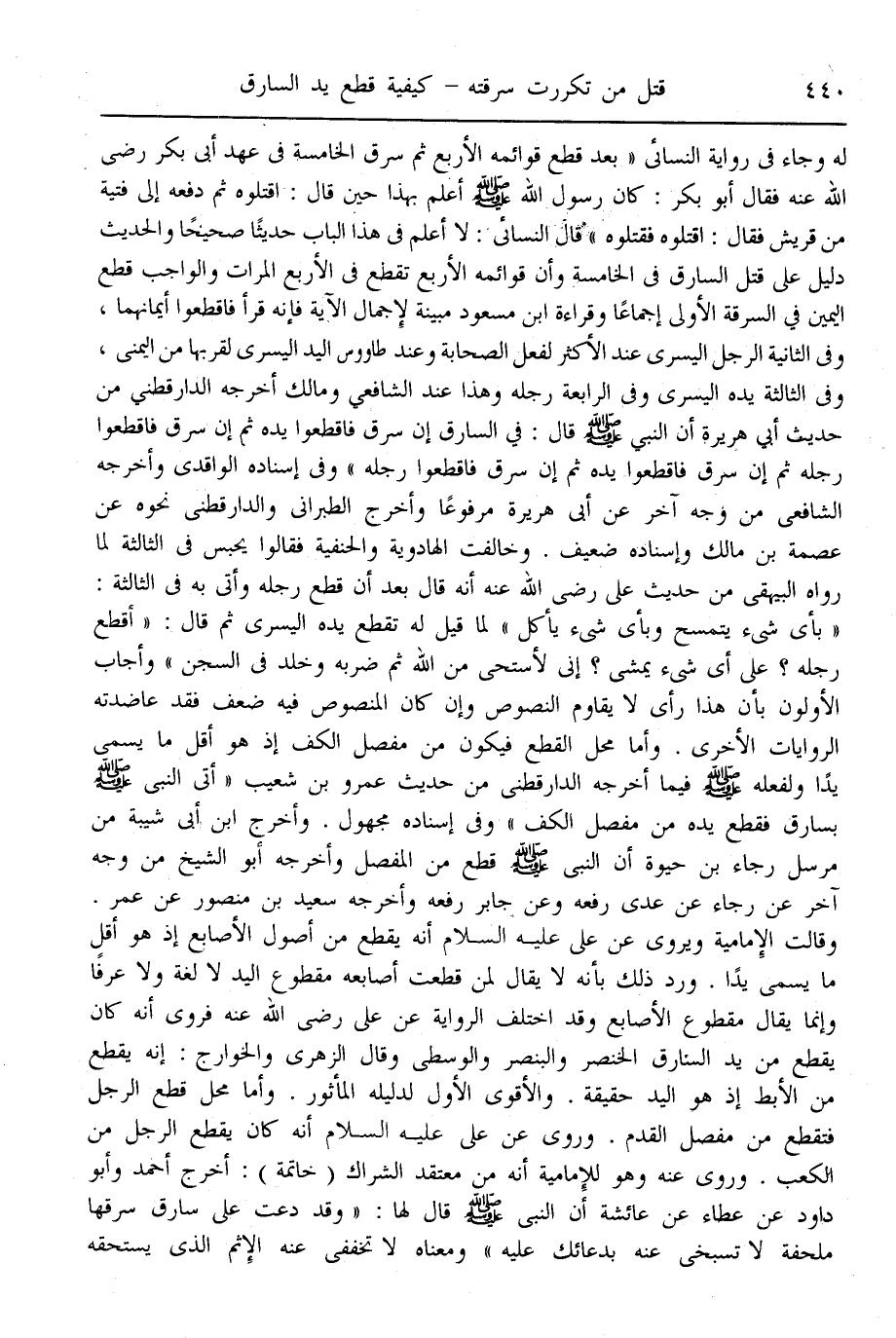 ـــــــــــــــــــــــــــــQلَهُ وَجَاءَ فِي رِوَايَةِ النَّسَائِيّ «بَعْدَ قَطْعِ قَوَائِمِهِ الْأَرْبَعِ ثُمَّ سَرَقَ الْخَامِسَةَ فِي عَهْدِ أَبِي بَكْرٍ - رَضِيَ اللَّهُ عَنْهُ - فَقَالَ أَبُو بَكْرٍ: كَانَ رَسُولُ اللَّهِ - صَلَّى اللَّهُ عَلَيْهِ وَسَلَّمَ - أَعْلَمَ بِهَذَا حِينَ قَالَ: اُقْتُلُوهُ ثُمَّ دَفَعَهُ إلَى فِتْيَةٍ مِنْ قُرَيْشٍ فَقَالَ: اُقْتُلُوهُ فَقَتَلُوهُ» قَالَ النَّسَائِيّ: لَا أَعْلَمُ فِي هَذَا الْبَابِ حَدِيثًا صَحِيحًا؛ وَالْحَدِيثُ دَلِيلٌ عَلَى قَتْلِ السَّارِقِ فِي الْخَامِسَةِ، وَأَنَّ قَوَائِمَهُ الْأَرْبَعَ تُقْطَعُ فِي الْأَرْبَعِ الْمَرَّاتِ وَالْوَاجِبُ قَطْعُ الْيَمِينِ فِي السَّرِقَةِ الْأُولَى إجْمَاعًا، وَقِرَاءَةُ ابْنِ مَسْعُودٍ مُبَيِّنَةٌ لِإِجْمَالِ الْآيَةِ فَإِنَّهُ قَرَأَ فَاقْطَعُوا أَيْمَانَهُمَا، وَفِي الثَّانِيَةِ الرِّجْلُ الْيُسْرَى عِنْدَ الْأَكْثَرِ لِفِعْلِ الصَّحَابَةِ، وَعِنْدَ طَاوُسٍ الْيَدُ الْيُسْرَى لِقُرْبِهَا مِنْ الْيُمْنَى، وَفِي الثَّالِثَةِ يَدُهُ الْيُسْرَى وَفِي الرَّابِعَةِ رِجْلُهُ وَهَذَا عِنْدَ الشَّافِعِيِّ وَمَالِكٍ وَأَخْرَجَهُ الدَّارَقُطْنِيُّ مِنْ حَدِيثِ أَبِي هُرَيْرَةَ «أَنَّ النَّبِيَّ - صَلَّى اللَّهُ عَلَيْهِ وَسَلَّمَ - قَالَ: فِي السَّارِقِ إنْ سَرَقَ: فَاقْطَعُوا يَدَهُ ثُمَّ إنْ سَرَقَ فَاقْطَعُوا رِجْلَهُ ثُمَّ إنْ سَرَقَ فَاقْطَعُوا يَدَهُ ثُمَّ إنْ سَرَقَ فَاقْطَعُوا رِجْلَهُ» وَفِي إسْنَادِهِ الْوَاقِدِيُّ وَأَخْرَجَهُ الشَّافِعِيُّ مِنْ وَجْهٍ آخَرَ عَنْ أَبِي هُرَيْرَةَ مَرْفُوعًا. وَأَخْرَجَ الطَّبَرَانِيُّ وَالدَّارَقُطْنِيّ نَحْوَهُ مِنْ عِصْمَةَ بْنِ مَالِكٍ وَإِسْنَادُهُ ضَعِيفٌ. وَخَالَفَتْ الْهَادَوِيَّةُ وَالْحَنَفِيَّةُ فَقَالُوا: يُحْبَسُ فِي الثَّالِثَةِ لِمَا رَوَاهُ الْبَيْهَقِيُّ مِنْ حَدِيثِ عَلِيٍّ - رَضِيَ اللَّهُ عَنْهُ - أَنَّهُ قَالَ بَعْدَ أَنْ قَطَعَ رِجْلَهُ وَأَتَى بِهِ فِي الثَّالِثَةِ: " بِأَيِّ شَيْءٍ يَتَمَسَّحُ وَبِأَيِّ شَيْءٍ يَأْكُلُ " لَمَّا قِيلَ لَهُ: تُقْطَعُ يَدُهُ الْيُسْرَى ثُمَّ قَالَ: " أَقْطَعُ رِجْلَهُ؟ عَلَى أَيِّ شَيْءٍ يَمْشِي؟ إنِّي لَأَسْتَحِي مِنْ اللَّهِ، ثُمَّ ضَرَبَهُ وَخُلِّدَ فِي السِّجْنِ " وَأَجَابَ الْأَوَّلُونَ بِأَنَّ هَذَا رَأْيٌ لَا يُقَاوِمُ النُّصُوصَ وَإِنْ كَانَ الْمَنْصُوصُ فِيهِ ضَعْفٌ فَقَدْ عَاضَدَتْهُ الرِّوَايَاتُ الْأُخْرَى.