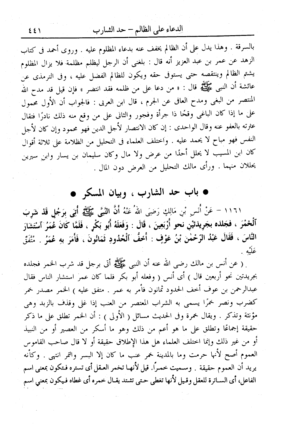 (1161) - عَنْ أَنَسِ بْنِ مَالِكٍ - رَضِيَ اللَّهُ عَنْهُ - أَنَّ النَّبِيَّ - صَلَّى اللَّهُ عَلَيْهِ وَسَلَّمَ - «أُتِيَ بِرَجُلٍ قَدْ شَرِبَ الْخَمْرَ، فَجَلَدَهُ بِجَرِيدَتَيْنِ نَحْوَ أَرْبَعِينَ، قَالَ: وَفَعَلَهُ أَبُو بَكْرٍ، فَلَمَّا كَانَ عُمَرُ اسْتَشَارَ النَّاسَ، فَقَالَ عَبْدُ الرَّحْمَنِ بْنُ عَوْفٍ: أَخَفُّ الْحُدُودِ ثَمَانُونَ، فَأَمَرَ بِهِ عُمَرُ.» مُتَّفَقٌ عَلَيْهِ.