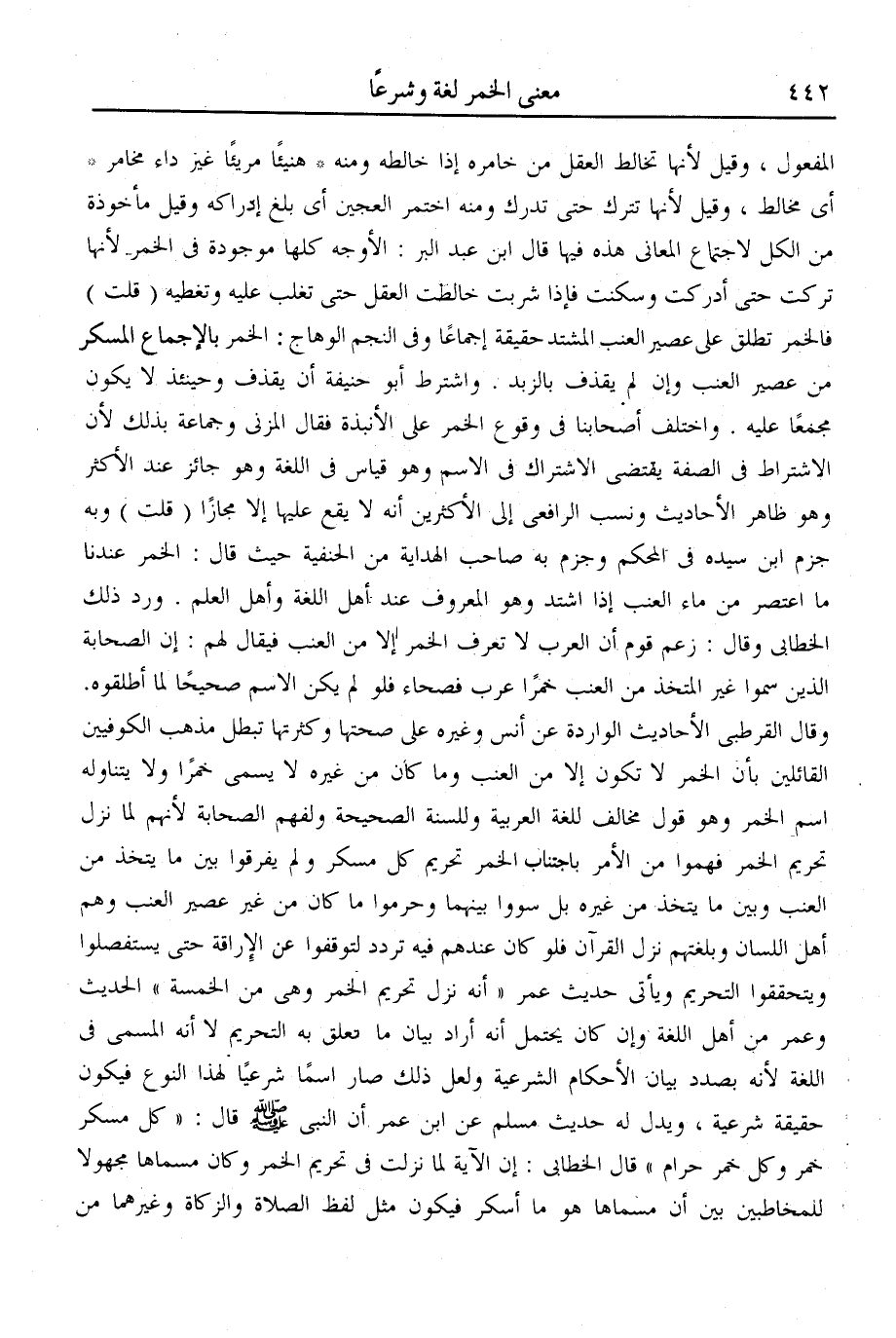 (قُلْت) وَبِهِ جَزَمَ ابْنُ سِيدَهْ فِي الْمُحْكَمِ وَجَزَمَ بِهِ صَاحِبُ الْهِدَايَةِ مِنْ الْحَنَفِيَّةِ حَيْثُ قَالَ: الْخَمْرُ عِنْدَنَا مَا اُعْتُصِرَ مِنْ مَاءِ الْعِنَبِ إذَا اشْتَدَّ، وَهُوَ الْمَعْرُوفُ عِنْدَ أَهْلِ اللُّغَةِ وَأَهْلِ الْعِلْمِ. وَرَدَّ ذَلِكَ الْخَطَّابِيُّ وَقَالَ: زَعَمَ قَوْمٌ أَنَّ الْعَرَبَ لَا تَعْرِفُ الْخَمْرَ إلَّا مِنْ الْعِنَبِ فَيُقَالُ لَهُمْ: إنَّ الصَّحَابَةَ الَّذِينَ سَمَّوْا غَيْرَ الْمُتَّخَذِ مِنْ الْعِنَبِ خَمْرًا عَرَبٌ فُصَحَاءُ فَلَوْ لَمْ يَكُنْ الِاسْمُ صَحِيحًا لَمَا أَطْلَقُوهُ.