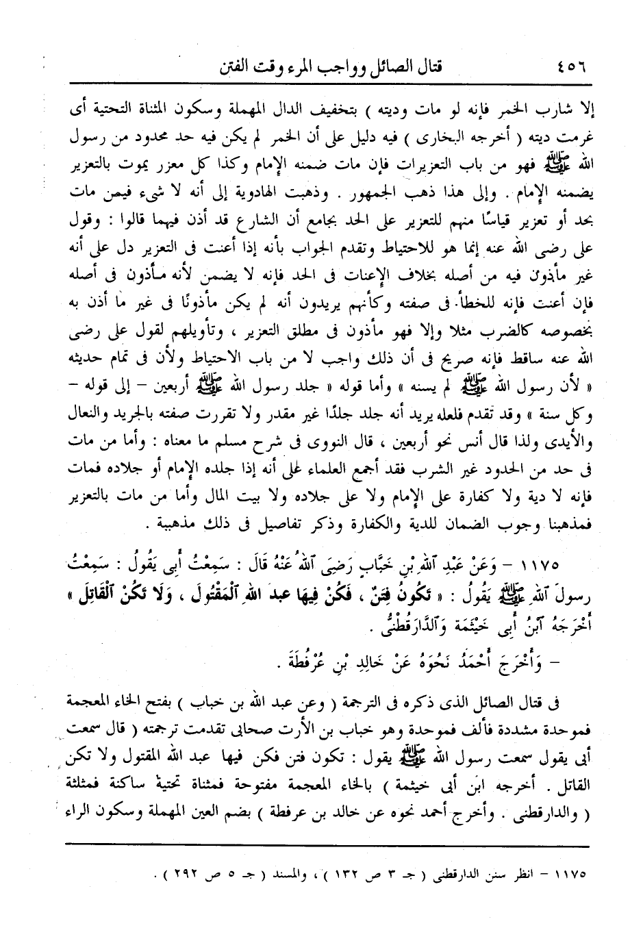(1175) - وَعَنْ عَبْدِ اللَّهِ بْنِ خَبَّابٍ - رَضِيَ اللَّهُ عَنْهُ - قَالَ: سَمِعْت أَبِي يَقُولُ: سَمِعْت رَسُولَ اللَّهِ - صَلَّى اللَّهُ عَلَيْهِ وَسَلَّمَ - يَقُولُ: «تَكُون فِتَنٌ، فَكُنْ فِيهَا عَبْدَ اللَّهِ الْمَقْتُولَ، وَلَا تَكُنْ الْقَاتِلَ» أَخْرَجَهُ ابْنُ أَبِي خَيْثَمَةَ وَالدَّارَقُطْنِيّ - وَأَخْرَجَ أَحْمَدُ نَحْوَهُ عَنْ خَالِدِ بْنِ عُرْفُطَةَ. فِي قِتَالِ الصَّائِلِ الَّذِي ذَكَرَهُ فِي التَّرْجَمَةِ