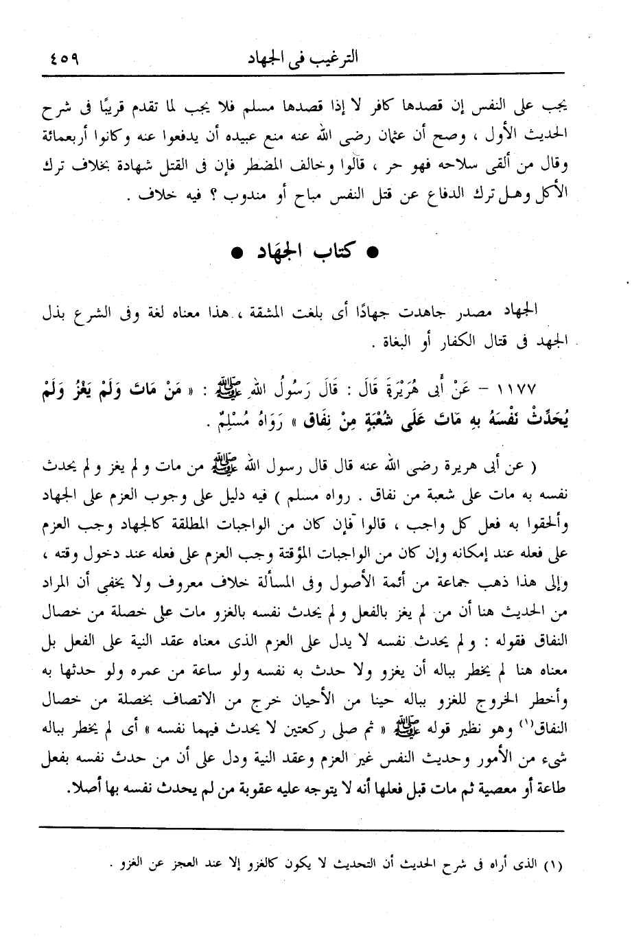 (1177) - عَنْ أَبِي هُرَيْرَةَ قَالَ: قَالَ رَسُولُ اللَّهِ - صَلَّى اللَّهُ عَلَيْهِ وَسَلَّمَ -: «مَنْ مَاتَ وَلَمْ يَغْزُ وَلَمْ يُحَدِّثْ نَفْسَهُ بِهِ مَاتَ عَلَى شُعْبَةٍ مِنْ نِفَاقٍ» رَوَاهُ مُسْلِمٌ.