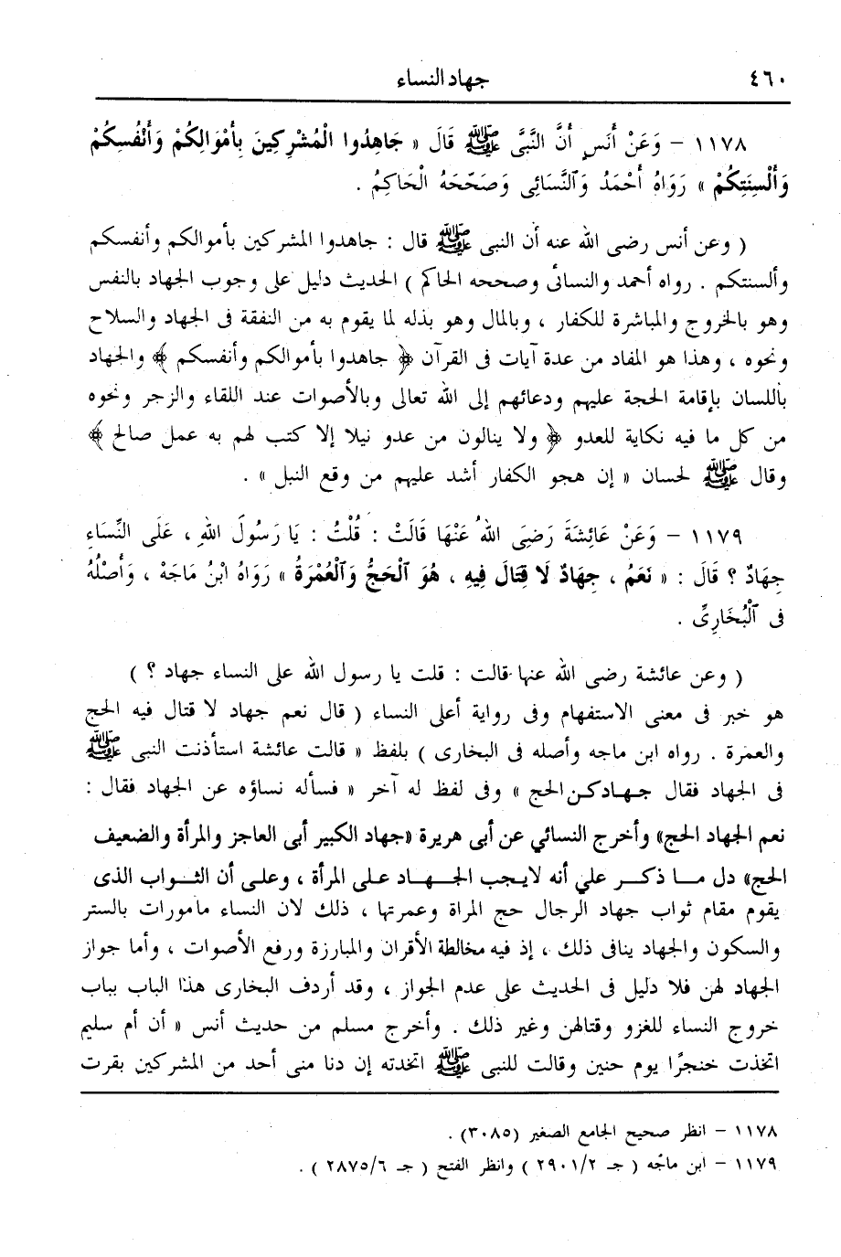 (1179) - وَعَنْ عَائِشَةَ - رَضِيَ اللَّهُ عَنْهَا - قَالَتْ: «قُلْت يَا رَسُولَ اللَّهِ، عَلَى النِّسَاءِ جِهَادٌ؟ قَالَ: نَعَمْ جِهَادٌ لَا قِتَالَ فِيهِ، هُوَ الْحَجُّ وَالْعُمْرَةُ» رَوَاهُ ابْنُ مَاجَهْ، وَأَصْلُهُ فِي الْبُخَارِيِّ.
