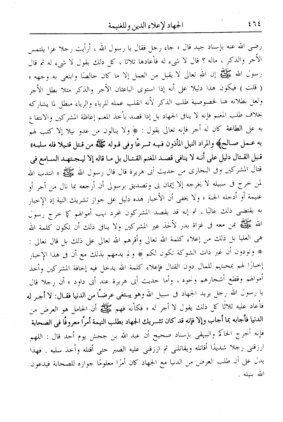 ـــــــــــــــــــــــــــــQ- رَضِيَ اللَّهُ عَنْهُ - بِإِسْنَادٍ جَيِّدٍ قَالَ «جَاءَ رَجُلٌ فَقَالَ يَا رَسُولَ اللَّهِ، أَرَأَيْت رَجُلًا غَزَا يَلْتَمِسُ الْأَجْرَ وَالذِّكْرَ، مَا لَهُ؟ قَالَ لَا شَيْءَ لَهُ فَأَعَادَهَا ثَلَاثًا، كُلُّ ذَلِكَ يَقُولُ لَا شَيْءَ لَهُ ثُمَّ قَالَ رَسُولُ اللَّهِ - صَلَّى اللَّهُ عَلَيْهِ وَسَلَّمَ - إنَّ اللَّهَ تَعَالَى لَا يَقْبَلُ مِنْ الْعَمَلِ إلَّا مَا كَانَ خَالِصًا وَابْتُغِيَ بِهِ وَجْهُهُ» (قُلْت) فَيَكُونُ هَذَا دَلِيلًا عَلَى أَنَّهُ إذَا اسْتَوَى الْبَاعِثَانِ الْأَجْرُ وَالذِّكْرُ مَثَلًا بَطَلَ الْأَجْرُ وَلَعَلَّ بُطْلَانَهُ هُنَا لِخُصُوصِيَّةِ طَلَبِ الذِّكْرِ لِأَنَّهُ انْقَلَبَ عَمَلُهُ لِلرِّيَاءِ وَالرِّيَاءُ مُبْطِلٌ لِمَا يُشَارِكُهُ بِخِلَافِ طَلَبِ الْمَغْنَمِ فَإِنَّهُ لَا يُنَافِي الْجِهَادَ بَلْ إذَا قَصَدَ بِأَخْذِ الْمَغْنَمِ إغَاظَةَ الْمُشْرِكِينَ وَالِانْتِفَاعَ بِهِ عَلَى الطَّاعَةِ كَانَ لَهُ أَجْرٌ فَإِنَّهُ تَعَالَى يَقُولُ: {وَلا يَنَالُونَ مِنْ عَدُوٍّ نَيْلا إِلا كُتِبَ لَهُمْ بِهِ عَمَلٌ صَالِحٌ} [التوبة: 120] وَالْمُرَادُ النَّيْلُ الْمَأْذُونُ فِيهِ شَرْعًا وَفِي قَوْلِهِ - صَلَّى اللَّهُ عَلَيْهِ وَسَلَّمَ - «مَنْ قَتَلَ قَتِيلًا فَلَهُ سَلَبُهُ» قَبْلَ الْقِتَالِ دَلِيلٌ عَلَى أَنَّهُ لَا يُنَافِي قَصْدُ الْمَغْنَمِ الْقِتَالَ بَلْ مَا قَالَهُ إلَّا لِيَجْتَهِدَ السَّامِعُ فِي قِتَالِ الْمُشْرِكِينَ وَفِي الْبُخَارِيِّ مِنْ حَدِيثِ أَبِي هُرَيْرَةَ قَالَ قَالَ رَسُولُ اللَّهِ - صَلَّى اللَّهُ عَلَيْهِ وَسَلَّمَ - «انْتَدَبَ اللَّهُ لِمَنْ خَرَجَ فِي سَبِيلِهِ لَا يُخْرِجُهُ إلَّا إيمَانٌ بِي وَتَصْدِيقٌ بِرَسُولِي أَنْ أُرْجِعَهُ بِمَا نَالَ مِنْ أَجْرٍ أَوْ غَنِيمَةٍ أَوْ أُدْخِلَهُ الْجَنَّةَ» وَلَا يَخْفَى أَنَّ الْأَخْبَارَ هَذِهِ دَلِيلٌ عَلَى جَوَازِ تَشْرِيكِ النِّيَّةِ إذْ الْإِخْبَارُ بِهِ يَقْتَضِي ذَلِكَ غَالِبًا؛ ثُمَّ إنَّهُ يَقْصِدُ الْمُشْرِكِينَ لِمُجَرَّدِ نَهْبِ أَمْوَالِهِمْ كَمَا «خَرَجَ رَسُولُ اللَّهِ - صَلَّى اللَّهُ عَلَيْهِ وَسَلَّمَ - بِمَنْ مَعَهُ فِي غُزَاةِ بَدْرٍ لِأَخْذِ عِيرِ الْمُشْرِكِينَ» ، وَلَا يُنَافِي ذَلِكَ أَنْ تَكُونَ كَلِمَةُ اللَّهِ هِيَ الْعُلْيَا بَلْ ذَلِكَ مِنْ إعْلَاءِ كَلِمَةِ اللَّهِ تَعَالَى؛ وَأَقَرَّهُمْ اللَّهُ تَعَالَى عَلَى ذَلِكَ بَلْ قَالَ تَعَالَى: {وَتَوَدُّونَ أَنَّ غَيْرَ ذَاتِ الشَّوْكَةِ تَكُونُ لَكُمْ} [الأنفال: 7] وَلَمْ يَذُمَّهُمْ بِذَلِكَ مَعَ أَنَّ فِي هَذَا الْإِخْبَارِ إخْبَارًا لَهُمْ بِمَحَبَّتِهِمْ لِلْمَالِ دُونَ الْقِتَالِ فَإِعْلَاءُ كَلِمَةِ اللَّهِ يَدْخُلُ فِيهِ إخَافَةُ الْمُشْرِكِينَ وَأَخْذُ أَمْوَالِهِمْ وَقَطْعُ أَشْجَارِهِمْ وَنَحْوِهِ؛ وَأَمَّا حَدِيثُ أَبِي هُرَيْرَةَ عِنْدَ أَبِي دَاوُد «أَنَّ رَجُلًا قَالَ يَا رَسُولَ اللَّهِ رَجُلٌ يُرِيدُ الْجِهَادَ فِي سَبِيلِ اللَّهِ وَهُوَ يَبْتَغِي عَرَضًا مِنْ الدُّنْيَا فَقَالَ: لَا أَجْرَ لَهُ فَأَعَادَ عَلَيْهِ ثَلَاثًا كُلُّ ذَلِكَ يَقُولُ لَا أَجْرَ لَهُ» فَكَأَنَّهُ فَهِمَ - صَلَّى اللَّهُ عَلَيْهِ وَسَلَّمَ - أَنَّ الْحَامِلَ هُوَ الْعَرَضُ مِنْ الدُّنْيَا فَأَجَابَهُ بِمَا أَجَابَ وَإِلَّا فَإِنَّهُ قَدْ كَانَ تَشْرِيكُ الْجِهَادِ بِطَلَبِ الْغَنِيمَةِ أَمْرًا مَعْرُوفًا فِي الصَّحَابَةِ فَإِنَّهُ أَخْرَجَ الْحَاكِمُ وَالْبَيْهَقِيُّ بِإِسْنَادٍ صَحِيحٍ أَنَّ عَبْدَ اللَّهِ بْنَ جَحْشٍ يَوْمَ أُحُدٍ قَالَ: اللَّهُمَّ اُرْزُقْنِي رَجُلًا شَدِيدًا أُقَاتِلُهُ وَيُقَاتِلُنِي، ثُمَّ اُرْزُقْنِي عَلَيْهِ الصَّبْرَ حَتَّى أَقْتُلَهُ وَآخُ