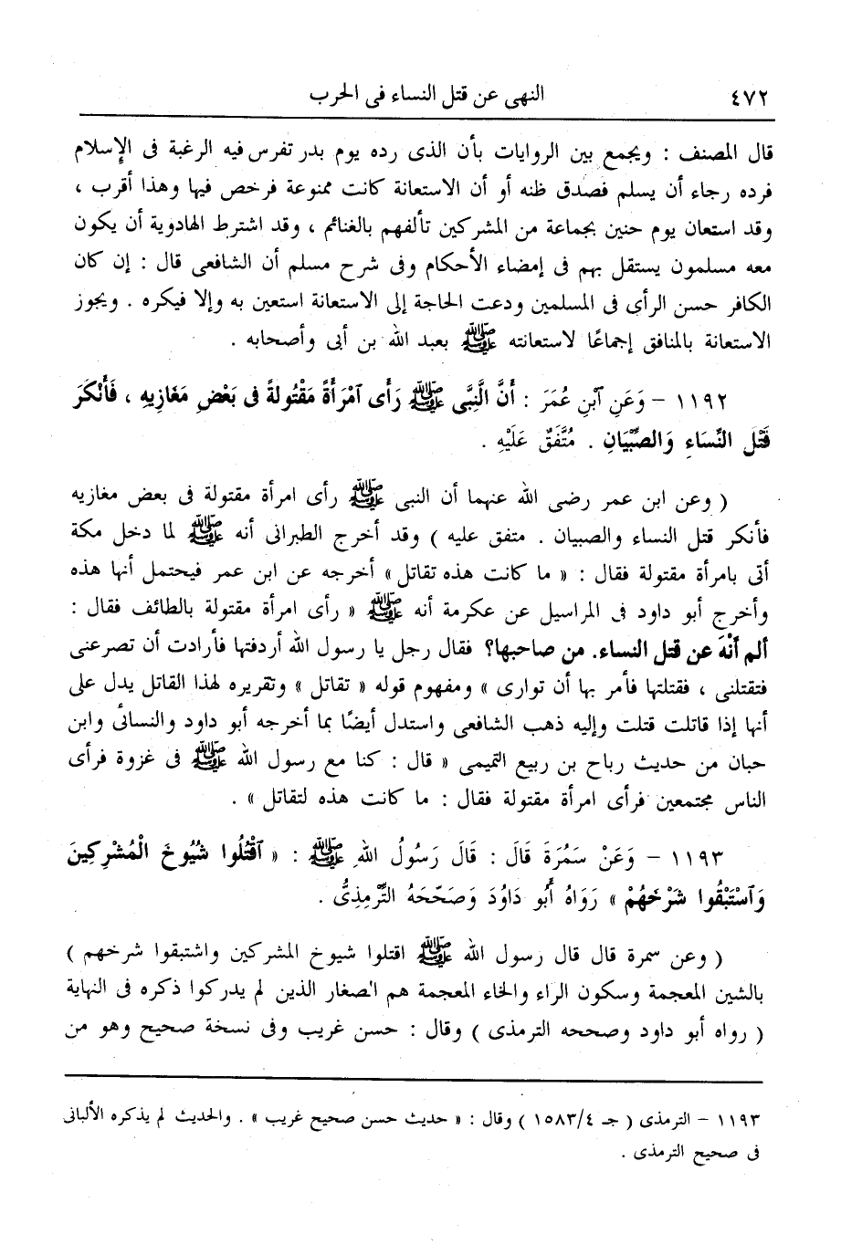 (1192) - وَعَنْ ابْنِ عُمَرَ: «أَنَّ النَّبِيَّ - صَلَّى اللَّهُ عَلَيْهِ وَسَلَّمَ - رَأَى امْرَأَةً مَقْتُولَةً فِي بَعْضِ مَغَازِيهِ، فَأَنْكَرَ قَتْلَ النِّسَاءِ وَالصِّبْيَانِ» . مُتَّفَقٌ عَلَيْهِ.