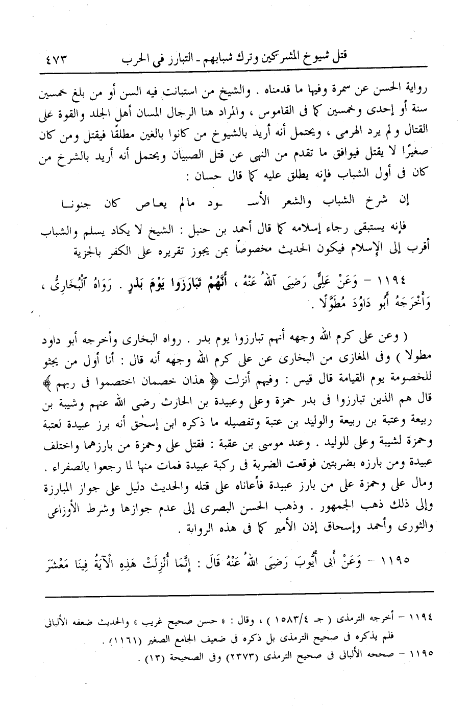 (1194) - وَعَنْ عَلِيٍّ - رَضِيَ اللَّهُ عَنْهُ -، أَنَّهُمْ تَبَارَزُوا يَوْمَ بَدْرٍ. رَوَاهُ الْبُخَارِيُّ، وَأَخْرَجَهُ أَبُو دَاوُد مُطَوَّلًا.