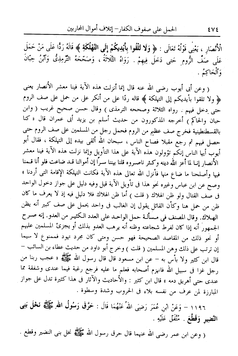 (وَعَنْ أَبِي أَيُّوبَ - رَضِيَ اللَّهُ عَنْهُ - قَالَ إنَّمَا أُنْزِلَتْ هَذِهِ الْآيَةُ فِينَا مَعْشَرَ الْأَنْصَارِ يَعْنِي {وَلا تُلْقُوا بِأَيْدِيكُمْ إِلَى التَّهْلُكَةِ} [البقرة: 195] قَالَهُ رَدًّا عَلَى مَنْ أَنْكَرَ عَلَى مَنْ حَمَلَ عَلَى صَفِّ الرُّومِ حَتَّى دَخَلَ فِيهِمْ. رَوَاهُ الثَّلَاثَةُ وَصَحَّحَهُ التِّرْمِذِيُّ) وَقَالَ حَسَنٌ صَحِيحٌ غَرِيبٌ (وَابْنُ حِبَّانَ وَالْحَاكِمُ) أَخْرَجَهُ الْمَذْكُورُونَ مِنْ حَدِيثِ أَسْلَمَ بْنِ يَزِيدَ أَبِي عِمْرَانَ قَالَ " كُنَّا بِالْقُسْطَنْطِينِيَّةِ فَخَرَجَ صَفٌّ عَظِيمٌ مِنْ الرُّومِ فَحَمَلَ رَجُلٌ مِنْ الْمُسْلِمِينَ عَلَى صَفِّ الرُّومِ حَتَّى حَصَلَ فِيهِمْ ثُمَّ رَجَعَ مُقْبِلًا فَصَاحَ النَّاسُ، سُبْحَانَ اللَّهِ أَلْقَى بِيَدِهِ إلَى التَّهْلُكَةِ، فَقَالَ أَبُو أَيُّوبَ أَيُّهَا النَّاسُ إنَّكُمْ تُؤَوِّلُونَ هَذِهِ الْآيَةَ عَلَى هَذَا التَّأْوِيلِ وَإِنَّمَا نَزَلَتْ هَذِهِ الْآيَةُ فِينَا مَعْشَرَ الْأَنْصَارِ إنَّا لَمَّا أَعَزَّ اللَّهُ دِينَهُ وَكَثُرَ نَاصِرُوهُ قُلْنَا بَيْنَنَا سِرًّا إنَّ أَمْوَالَنَا قَدْ ضَاعَتْ فَلَوْ أَنَّا قُمْنَا فِيهَا وَأَصْلَحْنَا مَا ضَاعَ مِنْهَا فَأَنْزَلَ اللَّهُ تَعَالَى هَذِهِ الْآيَةَ فَكَانَتْ التَّهْلُكَةُ الْإِقَامَةَ الَّتِي أَرَدْنَا " وَصَحَّ عَنْ ابْنِ عَبَّاسٍ وَغَيْرِهِ نَحْوُ هَذَا فِي تَأْوِيلِ الْآيَةِ قِيلَ وَفِيهِ دَلِيلٌ عَلَى جَوَازِ دُخُولِ الْوَاحِدِ فِي صَفِّ الْقِتَالِ وَلَوْ ظَنَّ الْهَلَاكَ (قُلْت) أَمَّا ظَنُّ الْهَلَاكِ فَلَا دَلِيلَ فِيهِ إذْ لَا يُعْرَفُ مَا كَانَ ظَنُّ مَنْ حَمَلَ هُنَا وَكَأَنَّ الْقَائِلَ يَقُولُ إنَّ الْغَالِبَ فِي وَاحِدٍ يَحْمِلُ عَلَى صَفٍّ كَبِيرٍ أَنَّهُ يَظُنُّ الْهَلَاكَ.