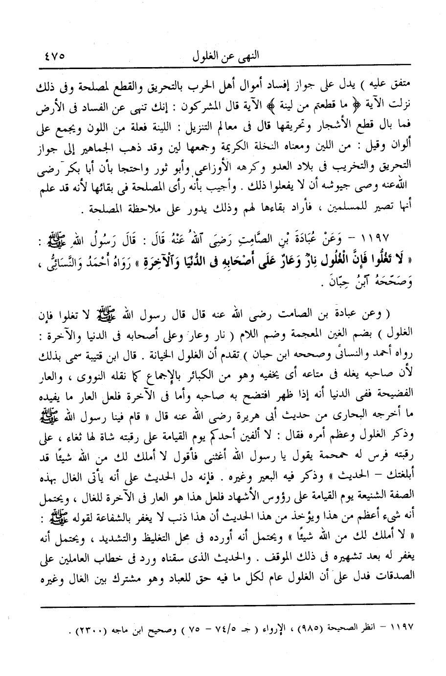 (1197) - وَعَنْ عُبَادَةَ بْنِ الصَّامِتِ - رَضِيَ اللَّهُ عَنْهُ - قَالَ: قَالَ رَسُولُ اللَّهِ - صَلَّى اللَّهُ عَلَيْهِ وَسَلَّمَ -: «لَا تَغُلُّوا فَإِنَّ الْغُلُولَ نَارٌ وَعَارٌ عَلَى أَصْحَابِهِ فِي الدُّنْيَا وَالْآخِرَةِ» رَوَاهُ أَحْمَدُ وَالنَّسَائِيُّ، وَصَحَّحَهُ ابْنُ حِبَّانَ.
