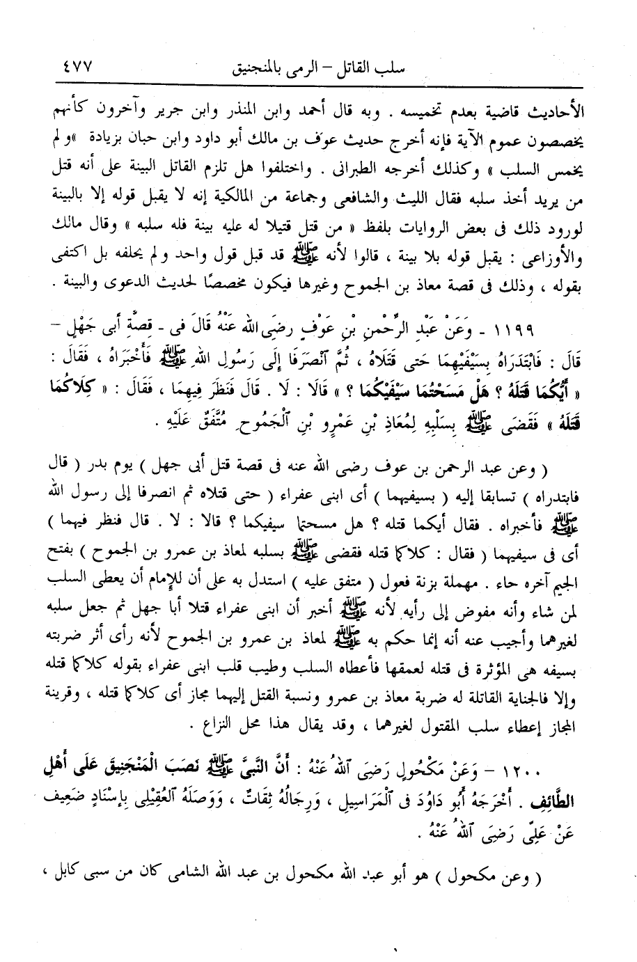 (1199) - «وَعَنْ عَبْدِ الرَّحْمَنِ بْنِ عَوْفٍ - رَضِيَ اللَّهُ عَنْهُ - قَالَ فِي - قِصَّةِ أَبِي جَهْلٍ - قَالَ: فَابْتَدَرَاهُ بِسَيْفَيْهِمَا حَتَّى قَتَلَاهُ، ثُمَّ انْصَرَفَا إلَى رَسُولِ اللَّهِ - صَلَّى اللَّهُ عَلَيْهِ وَسَلَّمَ - فَأَخْبَرَاهُ، فَقَالَ: أَيُّكُمَا قَتَلَهُ؟ هَلْ مَسَحْتُمَا سَيْفَيْكُمَا؟ قَالَا: لَا. قَالَ فَنَظَرَ فِيهِمَا، فَقَالَ: كِلَاكُمَا قَتَلَهُ فَقَضَى - صَلَّى اللَّهُ عَلَيْهِ وَسَلَّمَ - بِسَلَبِهِ لِمُعَاذِ بْنِ عَمْرِو بْنِ الْجَمُوحِ» مُتَّفَقٌ عَلَيْهِ.