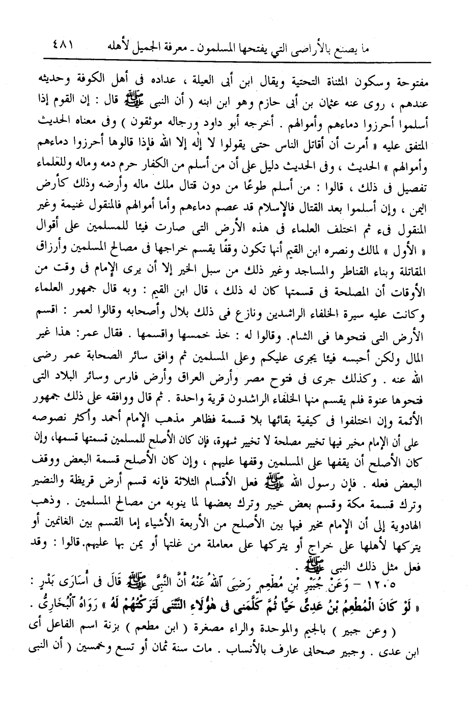 ـــــــــــــــــــــــــــــQعِدَادُهُ فِي أَهْلِ الْكُوفَة وَحَدِيثُهُ عِنْدَهُمْ، رَوَى عَنْهُ عُثْمَانُ بْنُ أَبِي حَازِمٍ وَهُوَ ابْنُ ابْنِهِ (أَنَّ النَّبِيَّ - صَلَّى اللَّهُ عَلَيْهِ وَسَلَّمَ - قَالَ: «إنَّ الْقَوْمَ إذَا أَسْلَمُوا أَحْرَزُوا دِمَاءَهُمْ وَأَمْوَالَهُمْ» . أَخْرَجَهُ أَبُو دَاوُد وَرِجَالُهُ مُوَثَّقُونَ) وَفِي مَعْنَاهُ الْحَدِيثُ الْمُتَّفَقُ عَلَيْهِ «أُمِرْت أَنْ أُقَاتِلَ النَّاسَ حَتَّى يَقُولُوا لَا إلَهَ إلَّا اللَّهُ فَإِذَا قَالُوهَا أَحْرَزُوا دِمَاءَهُمْ وَأَمْوَالَهُمْ» الْحَدِيثَ، وَفِي الْحَدِيثِ دَلِيلٌ عَلَى أَنَّ مَنْ أَسْلَمَ مِنْ الْكُفَّارِ حَرُمَ دَمُهُ وَمَالُهُ وَلِلْعُلَمَاءِ تَفْصِيلٌ فِي ذَلِكَ، قَالُوا: مَنْ أَسْلَمَ طَوْعًا مِنْ دُونِ قِتَالٍ مَلَكَ مَالَهُ وَأَرْضَهُ وَذَلِكَ كَأَرْضِ الْيَمَنِ، وَإِنْ أَسْلَمُوا بَعْدَ الْقِتَالِ فَالْإِسْلَامُ قَدْ عَصَمَ دِمَاءَهُمْ وَأَمَّا أَمْوَالُهُمْ فَالْمَنْقُولُ غَنِيمَةٌ وَغَيْرُ الْمَنْقُولِ فَيْءٌ ثُمَّ اخْتَلَفَ الْعُلَمَاءُ فِي هَذِهِ الْأَرْضِ الَّتِي صَارَتْ فَيْئًا لِلْمُسْلِمِينَ عَلَى أَقْوَالٍ (الْأَوَّلُ) لِمَالِكٍ وَنَصَرَهُ ابْنُ الْقَيِّمِ أَنَّهَا تَكُونُ وَقْفًا يُقْسَمُ خَرَاجُهَا فِي مَصَالِحِ الْمُسْلِمِينَ وَأَرْزَاقِ الْمُقَاتِلَةِ وَبِنَاءِ الْقَنَاطِرِ وَالْمَسَاجِدِ وَغَيْرِ ذَلِكَ مِنْ سُبُلِ الْخَيْرِ إلَّا أَنْ يَرَى الْإِمَامُ فِي وَقْتٍ مِنْ الْأَوْقَاتِ أَنَّ الْمَصْلَحَةَ فِي قِسْمَتِهَا كَانَ لَهُ ذَلِكَ، قَالَ ابْنُ الْقَيِّمِ: وَبِهِ قَالَ جُمْهُورُ الْعُلَمَاءِ وَكَانَتْ عَلَيْهِ سِيرَةُ الْخُلَفَاءِ الرَّاشِدِينَ وَنَازَعَ فِي ذَلِكَ بِلَالٌ وَأَصْحَابُهُ وَقَالُوا لِعُمَرَ: اقْسِمْ الْأَرْضَ الَّتِي فَتَحُوهَا فِي الشَّامِ. وَقَالُوا لَهُ: خُذْ خُمُسَهَا وَاقْسِمْهَا. فَقَالَ عُمَرُ: هَذَا غَيْرُ الْمَالِ وَلَكِنْ أَحْبِسُهُ فَيْئًا يَجْرِي عَلَيْكُمْ وَعَلَى الْمُسْلِمِينَ ثُمَّ وَافَقَ سَائِرُ الصَّحَابَةِ عُمَرَ - رَضِيَ اللَّهُ عَنْهُ -.