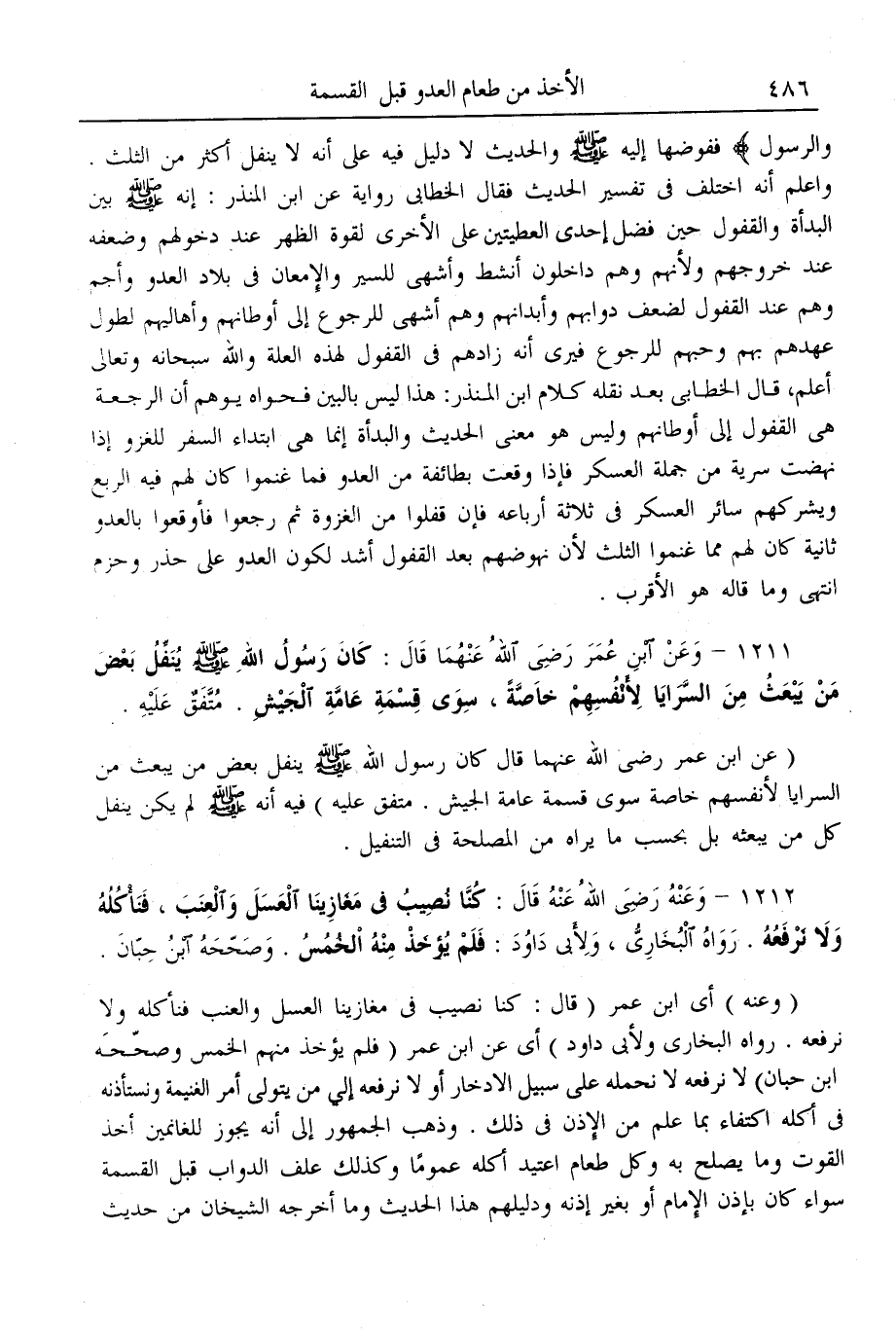 (1211) - وَعَنْ ابْنِ عُمَرَ - رَضِيَ اللَّهُ عَنْهُمَا - قَالَ: «كَانَ رَسُولُ اللَّهِ - صَلَّى اللَّهُ عَلَيْهِ وَسَلَّمَ - يُنَفِّلُ بَعْضَ مَنْ يَبْعَثُ مِنْ السَّرَايَا لِأَنْفُسِهِمْ خَاصَّةً، سِوَى قِسْمَةِ عَامَّةِ الْجَيْشِ» . مُتَّفَقٌ عَلَيْهِ.