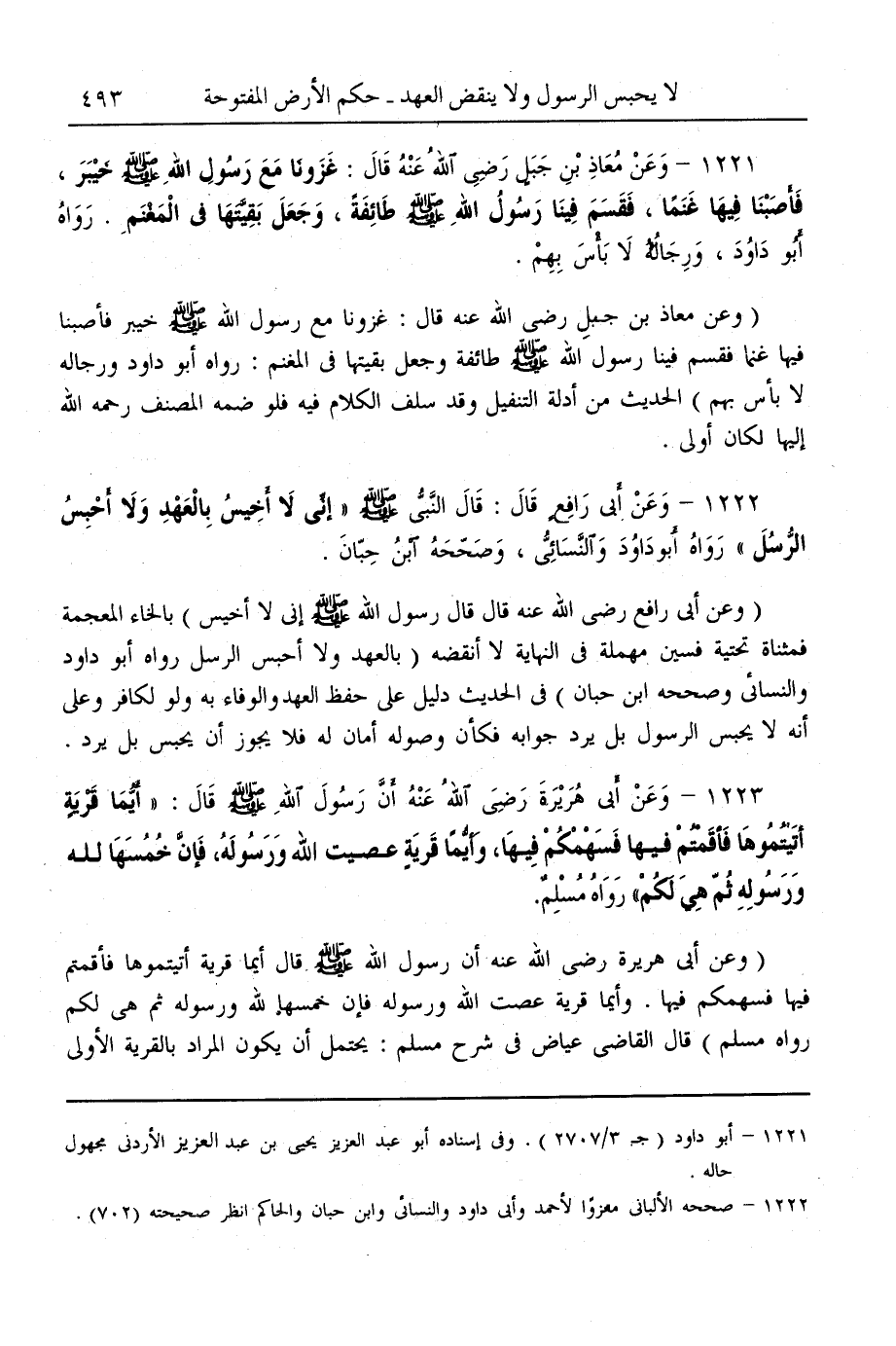 (1222) - وَعَنْ أَبِي رَافِعٍ قَالَ: قَالَ النَّبِيُّ - صَلَّى اللَّهُ عَلَيْهِ وَسَلَّمَ - «إنِّي لَا أَخِيسُ بِالْعَهْدِ وَلَا أَحْبِسُ الرُّسُلَ» رَوَاهُ أَبُو دَاوُد وَالنَّسَائِيُّ، وَصَحَّحَهُ ابْنُ حِبَّانَ