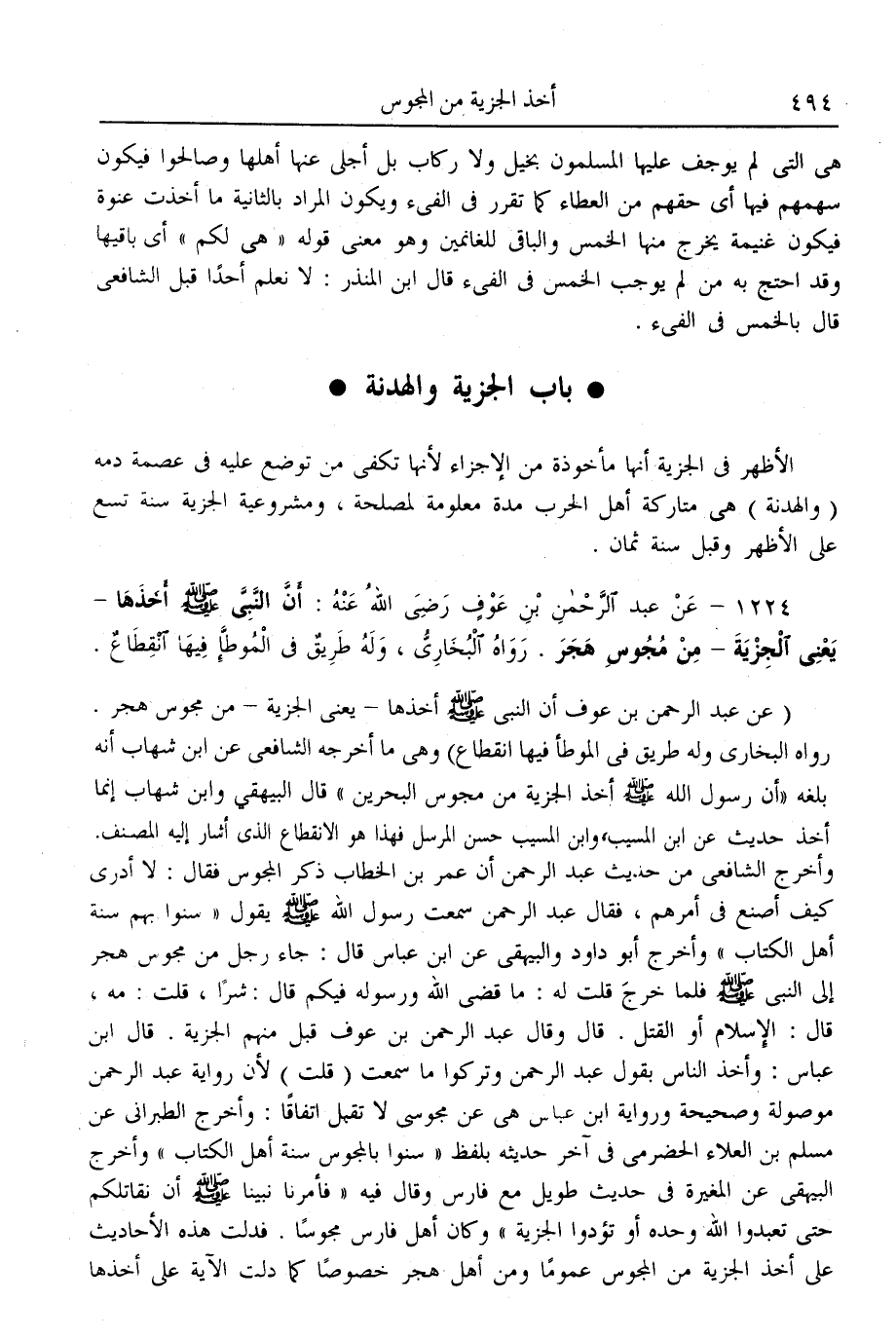 (1224) - عَنْ عَبْدِ الرَّحْمَنِ بْنِ عَوْفٍ - رَضِيَ اللَّهُ عَنْهُ -: «أَنَّ النَّبِيَّ - صَلَّى اللَّهُ عَلَيْهِ وَسَلَّمَ - أَخَذَهَا - يَعْنِي الْجِزْيَةَ - مِنْ مَجُوسِ هَجَرَ» . رَوَاهُ الْبُخَارِيُّ، وَلَهُ طَرِيقٌ فِي الْمُوَطَّأِ فِيهَا انْقِطَاعٌ.