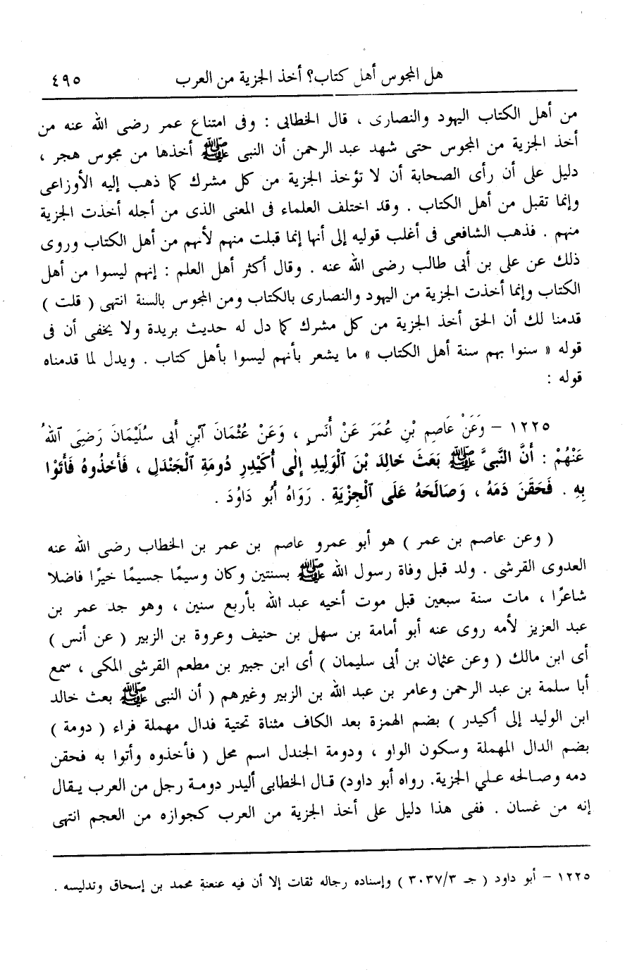 (1225) - وَعَنْ عَاصِمِ بْنِ عُمَرَ عَنْ أَنَسٍ، وَعَنْ عُثْمَانَ بْنِ أَبِي سُلَيْمَانَ - رَضِيَ اللَّهُ عَنْهُمْ -: أَنَّ «النَّبِيَّ - صَلَّى اللَّهُ عَلَيْهِ وَسَلَّمَ - بَعَثَ خَالِدَ بْنَ الْوَلِيدِ إلَى أُكَيْدِرِ دَوْمَةِ الْجَنْدَلِ، فَأَخَذُوهُ فَأَتَوْا بِهِ. فَحَقَنَ دَمَهُ، وَصَالَحَهُ عَلَى الْجِزْيَةِ» . رَوَاهُ أَبُو دَاوُد