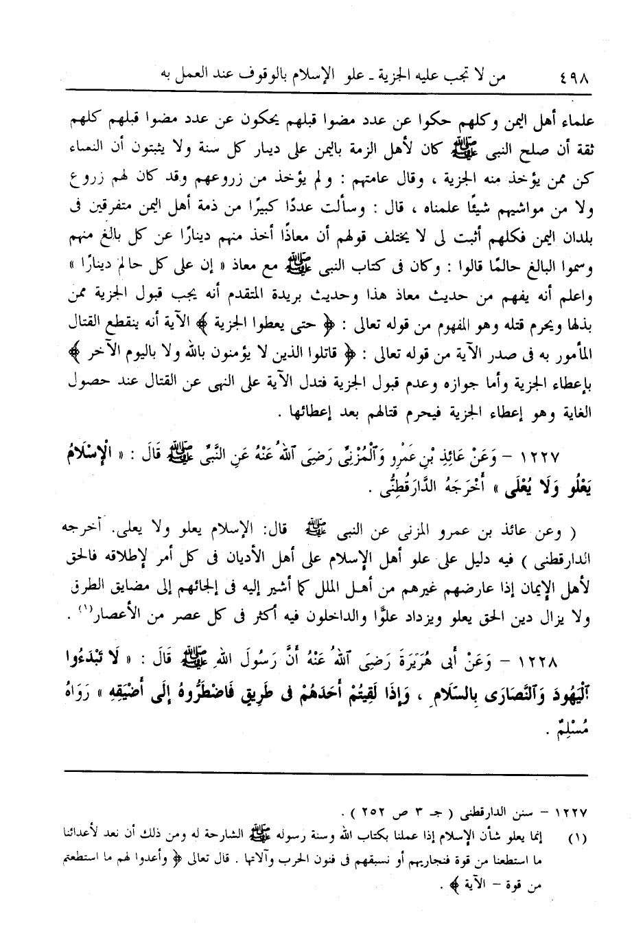 (1227) - وَعَنْ عَائِذِ بْنِ عَمْرٍو الْمُزَنِيِّ - رَضِيَ اللَّهُ عَنْهُ - عَنْ النَّبِيِّ - صَلَّى اللَّهُ عَلَيْهِ وَسَلَّمَ - قَالَ: «الْإِسْلَامُ يَعْلُو وَلَا يُعْلَى» أَخْرَجَهُ الدَّارَقُطْنِيُّ.