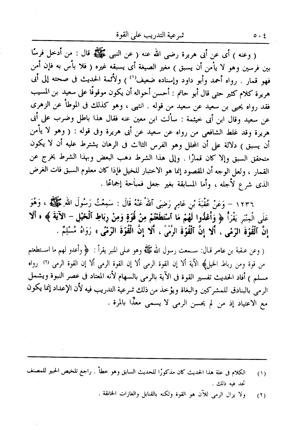 (وَعَنْ عُقْبَةَ بْنِ عَامِرٍ قَالَ: «سَمِعْت رَسُولَ اللَّهِ - صَلَّى اللَّهُ عَلَيْهِ وَسَلَّمَ - وَهُوَ يَقْرَأُ عَلَى الْمِنْبَرِ: {وَأَعِدُّوا لَهُمْ مَا اسْتَطَعْتُمْ مِنْ قُوَّةٍ وَمِنْ رِبَاطِ الْخَيْلِ} [الأنفال: 60] الْآيَةَ أَلَا إنَّ الْقُوَّةَ الرَّمْيُ أَلَا إنَّ الْقُوَّةَ الرَّمْيُ أَلَا إنَّ الْقُوَّةَ الرَّمْيُ» رَوَاهُ مُسْلِمٌ) أَفَادَ الْحَدِيثُ تَفْسِيرَ الْقُوَّةِ فِي الْآيَةِ بِالرَّمْيِ بِالسِّهَامِ لِأَنَّهُ الْمُعْتَادُ فِي عَصْرِ النُّبُوَّةِ وَيَشْمَلُ الرَّمْيَ بِالْبَنَادِقِ لَلْمُشْرِكِينَ وَالْبُغَاةِ وَيُؤْخَذُ مِنْ ذَلِكَ شَرْعِيَّةُ التَّدْرِيبِ فِيهِ لِأَنَّ الْإِعْدَادَ إنَّمَا يَكُونُ مَعَ الِاعْتِيَادِ إذْ مَنْ لَمْ يُحْسِنْ الرَّمْيَ لَا يُسَمَّى مُعِدًّا بِالْمَرَّةِ.