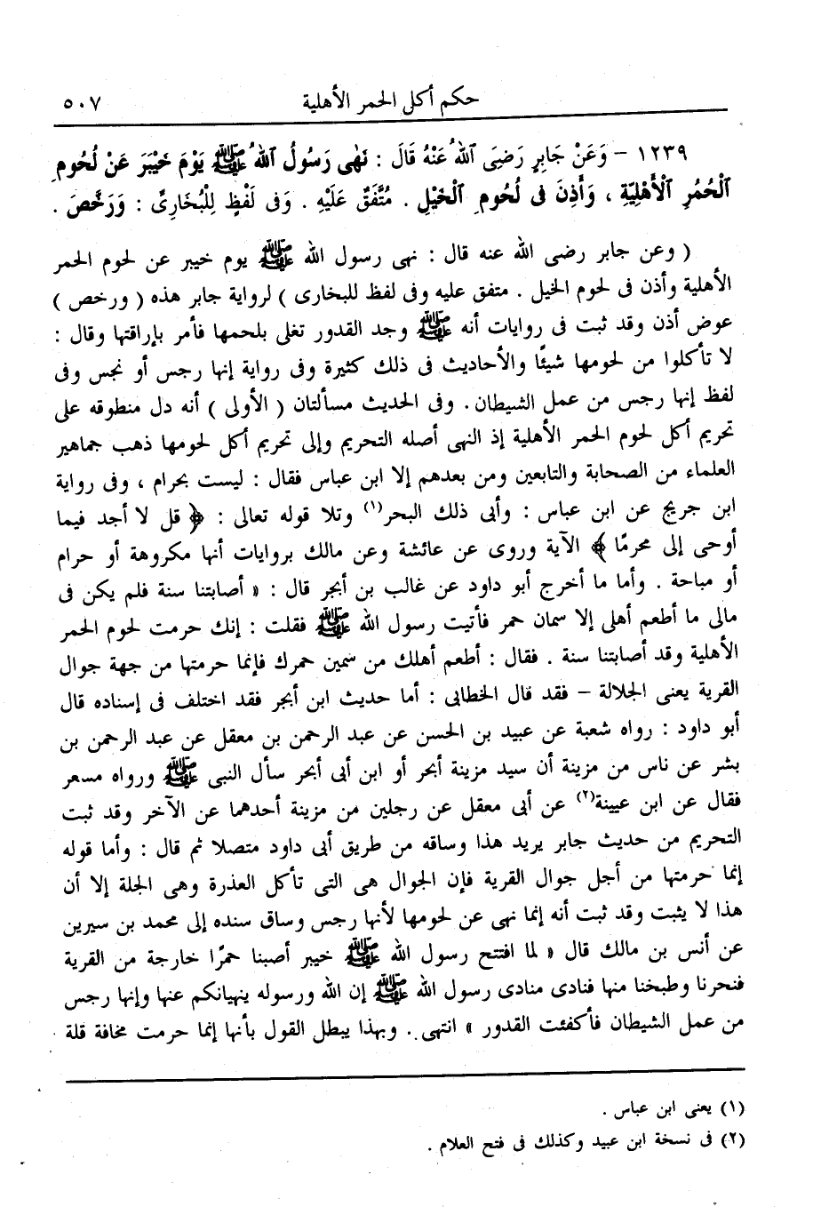 وَفِي الْحَدِيثِ مَسْأَلَتَانِ (الْأُولَى) أَنَّهُ دَلَّ مَنْطُوقُهُ عَلَى تَحْرِيمِ أَكْلِ لُحُومِ الْحُمُرِ الْأَهْلِيَّةِ إذْ النَّهْيُ أَصْلُهُ التَّحْرِيمُ وَإِلَى تَحْرِيمِ أَكْلِ لُحُومِهَا ذَهَبَ جَمَاهِيرُ الْعُلَمَاءِ مِنْ الصَّحَابَةِ وَالتَّابِعِينَ وَمَنْ بَعْدَهُمْ إلَّا ابْنُ عَبَّاسٍ فَقَالَ: لَيْسَتْ بِحَرَامٍ، وَفِي رِوَايَةِ ابْنِ جُرَيْجٍ عَنْ ابْنِ عَبَّاسٍ: وَأَبَى ذَلِكَ الْبَحْرُ وَتَلَا قَوْله تَعَالَى {قُلْ لا أَجِدُ فِي مَا أُوحِيَ إِلَيَّ مُحَرَّمًا} [الأنعام: 145] الْآيَةَ وَرُوِيَ عَنْ عَائِشَةَ وَعَنْ مَالِكٍ بِرِوَايَاتٍ أَنَّهَا مَكْرُوهَةٌ أَوْ حَرَامٌ أَوْ مُبَاحَةٌ. وَأَمَّا مَا أَخْرَجَ أَبُو دَاوُد عَنْ غَالِبِ بْنِ أَبْجَرَ قَالَ: «أَصَابَتْنَا سَنَةٌ فَلَمْ يَكُنْ فِي مَالِي مَا أُطْعِمُ أَهْلِي إلَّا سِمَانُ حُمُرٍ فَأَتَيْت رَسُولَ اللَّهِ - صَلَّى اللَّهُ عَلَيْهِ وَسَلَّمَ - فَقُلْت: إنَّك حَرَّمْت لُحُومَ الْحُمُرِ الْأَهْلِيَّةِ وَقَدْ أَصَابَتْنَا سَنَةٌ. فَقَالَ: أَطْعِمْ أَهْلَك مِنْ سَمِينِ حُمُرِك فَإِنَّمَا حَرَّمْتهَا مِنْ جِهَةِ جَوَّالِ الْقَرْيَةِ» يَعْنِي الْجَلَّالَةَ - فَقَدْ قَالَ الْخَطَّابِيُّ: أَمَّا حَدِيثُ ابْنِ أَبْجَرَ فَقَدْ اُخْتُلِفَ فِي إسْنَادِهِ قَالَ أَبُو دَاوُد. رَوَاهُ شُعْبَةُ عَنْ عُبَيْدِ بْنِ الْحَسَنِ عَنْ عَبْدِ الرَّحْمَنِ بْنِ مَعْقِلٍ عَنْ عَبْدِ الرَّحْمَنِ بْنِ بِشْرٍ عَنْ نَاسٍ مِنْ مُزَيْنَةَ أَنَّ سَيِّدَ مُزَيْنَةَ أَبْجَرَ أَوْ ابْنَ أَبِي أَبْجَرَ سَأَلَ النَّبِيَّ - صَلَّى اللَّهُ عَلَيْهِ وَسَلَّمَ - وَرَوَاهُ مِسْعَرٌ فَقَالَ عَنْ ابْنِ عُيَيْنَةَ عَنْ أَبِي مَعْقِلٍ عَنْ رَجُلَيْنِ مِنْ مُزَيْنَةَ أَحَدُهُمَا عَنْ الْآخَرِ وَقَدْ ثَبَتَ التَّحْرِيمُ مِنْ حَدِيثِ جَابِرٍ يُرِيدُ هَذَا وَسَاقَهُ مِنْ طَرِيقِ أَبِي دَاوُد مُتَّصِلًا ثُمَّ قَالَ: وَأَمَّا قَوْلُهُ إنَّمَا حَرَّمْتهَا مِنْ أَجْلِ جَوَّالِ الْقَرْيَةِ فَإِنَّ الْجَوَّالَ هِيَ الَّتِي تَأْكُلُ الْعَذِرَةَ وَهِيَ الْجِلَّةُ إلَّا أَنَّ هَذَا لَا يَثْبُتُ وَقَدْ ثَبَتَ أَنَّهُ إنَّمَا نَهَى عَنْ لُحُومِهَا لِأَنَّهَا رِجْسٌ وَسَاقَ سَنَدَهُ إلَى مُحَمَّدِ بْنِ سِيرِينَ عَنْ أَنَسِ بْنِ مَالِكٍ قَالَ «لَمَّا افْتَتَحَ رَسُولُ اللَّهِ - صَلَّى اللَّهُ عَلَيْهِ وَسَلَّمَ - خَيْبَرَ أَصَبْنَا حُمُرًا خَارِجَةً مِنْ الْقَرْيَةِ فَنَحَرْنَا وَطَبَخْنَا مِنْهَا فَنَادَى مُنَادِي رَسُولِ اللَّهِ - صَلَّى اللَّهُ عَلَيْهِ وَسَلَّمَ - إنَّ اللَّهَ وَرَسُولَهُ يَنْهَيَانِكُمْ عَنْهَا وَإِنَّهَا رِجْسٌ مِنْ عَمَلِ الشَّيْطَانِ فَأُكْفِئَتْ الْقُدُورُ» انْتَهَى. وَبِهَذَا يَبْطُلُ الْقَوْلُ بِأَنَّهَا إنَّمَا حُرِّمَتْ مَخَافَةَ قِلَّةِ