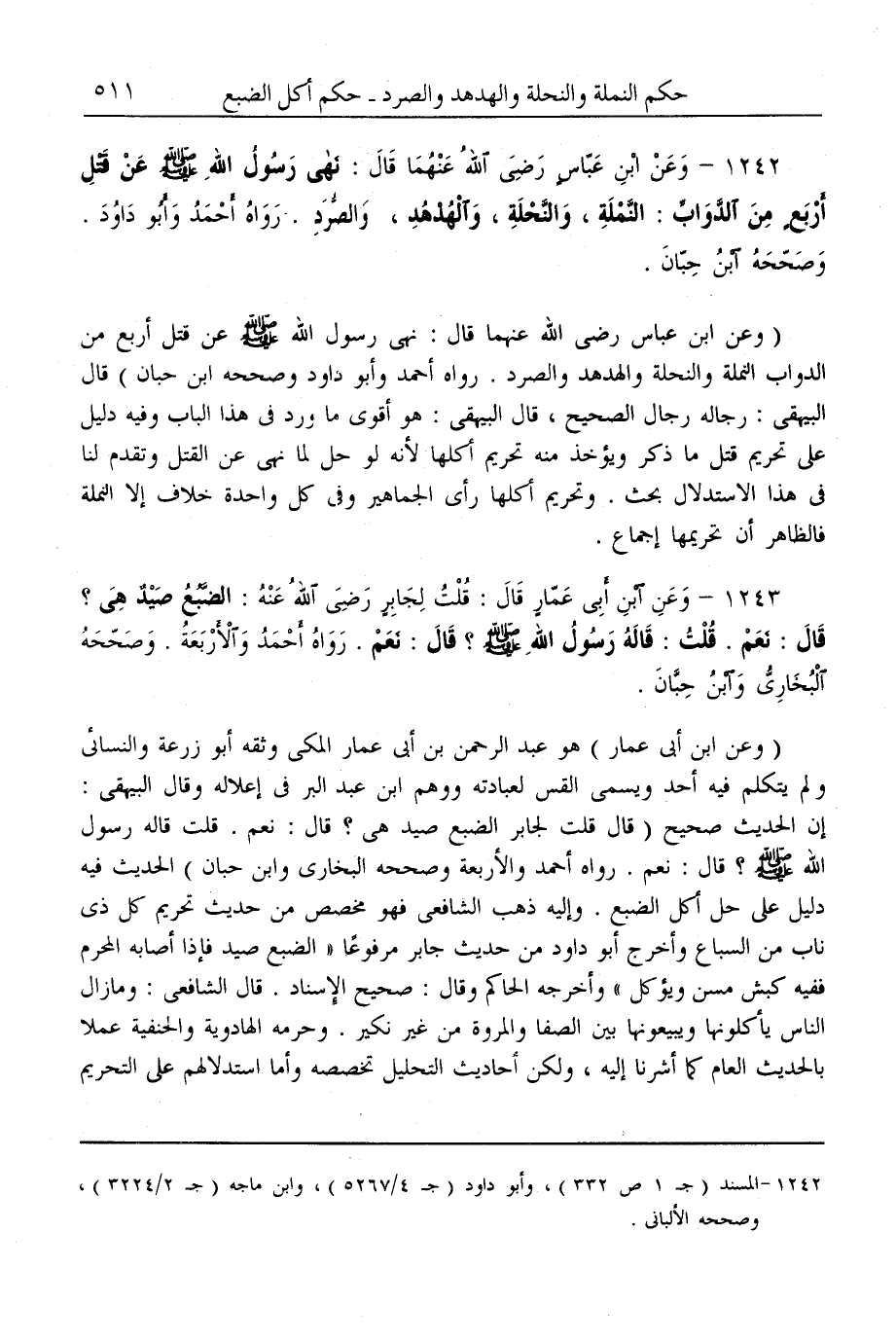 (1243) - وَعَنْ «ابْنِ أَبِي عَمَّارٍ قَالَ: قُلْت لِجَابِرٍ - رَضِيَ اللَّهُ عَنْهُ -: الضَّبُعُ صَيْدٌ هِيَ؟ قَالَ: نَعَمْ. قُلْت: قَالَهُ رَسُولُ اللَّهِ - صَلَّى اللَّهُ عَلَيْهِ وَسَلَّمَ -؟ قَالَ: نَعَمْ» . رَوَاهُ أَحْمَدُ وَالْأَرْبَعَةُ. وَصَحَّحَهُ الْبُخَارِيُّ وَابْنُ حِبَّانَ.
