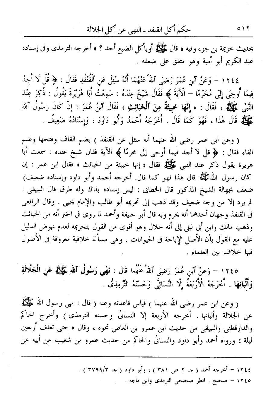 (1245) - وَعَنْ ابْنِ عُمَرَ - رَضِيَ اللَّهُ عَنْهُمَا - قَالَ: «نَهَى رَسُولُ اللَّهِ - صَلَّى اللَّهُ عَلَيْهِ وَسَلَّمَ - عَنْ الْجَلَّالَةِ وَأَلْبَانِهَا» . أَخْرَجَهُ الْأَرْبَعَةُ إلَّا النَّسَائِيّ وَحَسَّنَهُ التِّرْمِذِيُّ.
