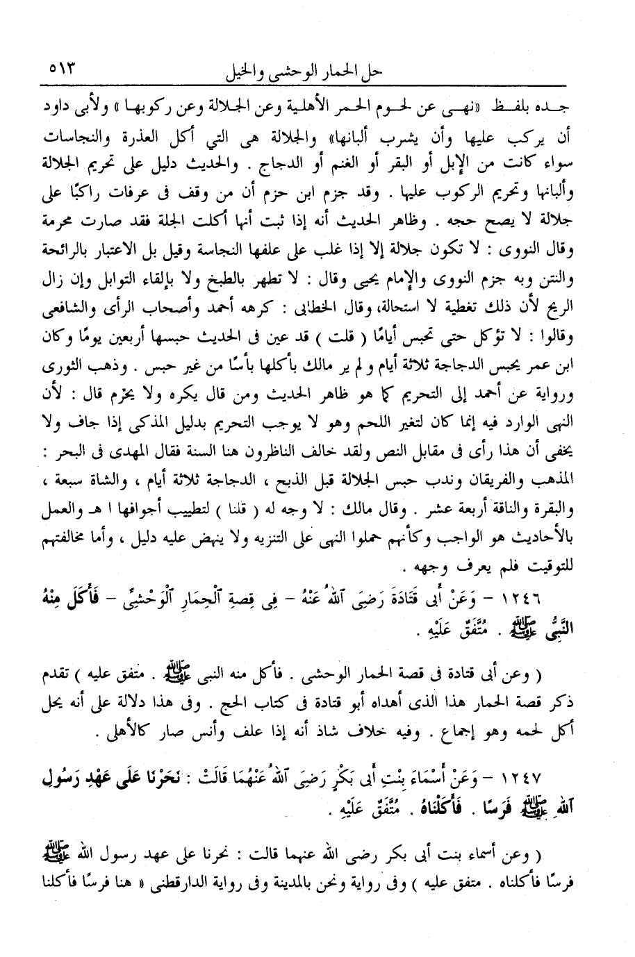 (1247) - وَعَنْ أَسْمَاءَ بِنْتِ أَبِي بَكْرٍ - رَضِيَ اللَّهُ عَنْهُمَا - قَالَتْ: «نَحَرْنَا عَلَى عَهْدِ رَسُولِ اللَّهِ - صَلَّى اللَّهُ عَلَيْهِ وَسَلَّمَ - فَرَسًا. فَأَكَلْنَاهُ» . مُتَّفَقٌ عَلَيْهِ.
