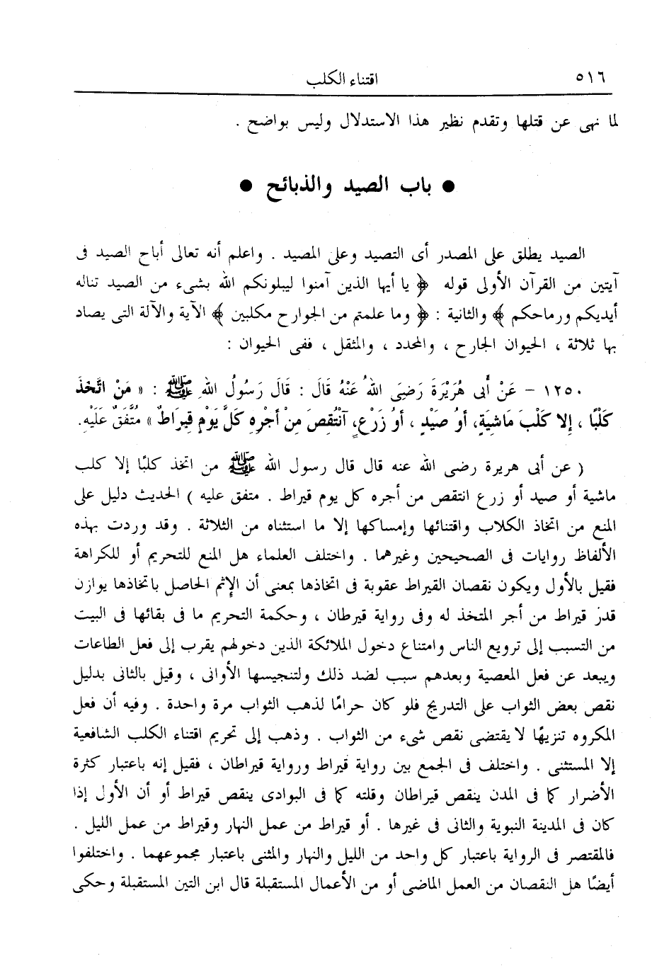 (1250) - عَنْ أَبِي هُرَيْرَةَ - رَضِيَ اللَّهُ عَنْهُ - قَالَ: قَالَ رَسُولُ اللَّهِ - صَلَّى اللَّهُ عَلَيْهِ وَسَلَّمَ -: «مَنْ اتَّخَذَ كَلْبًا، إلَّا كَلْبَ مَاشِيَةٍ، أَوْ صَيْدٍ أَوْ زَرْعٍ، اُنْتُقِصَ مِنْ أَجْرِهِ كُلَّ يَوْمٍ قِيرَاطٌ» مُتَّفَقٌ عَلَيْهِ.