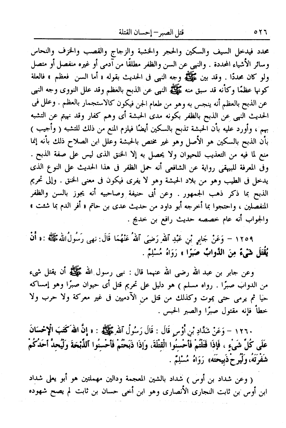 (1260) - وَعَنْ شَدَّادِ بْنِ أَوْسٍ قَالَ: قَالَ رَسُولُ اللَّهِ - صَلَّى اللَّهُ عَلَيْهِ وَسَلَّمَ -: «إنَّ اللَّهَ كَتَبَ الْإِحْسَانَ عَلَى كُلِّ شَيْءٍ، فَإِذَا قَتَلْتُمْ فَأَحْسِنُوا الْقِتْلَةَ، وَإِذَا ذَبَحْتُمْ فَأَحْسِنُوا الذِّبْحَةَ وَلْيُحِدَّ أَحَدُكُمْ شَفْرَتَهُ، وَلْيُرِحْ ذَبِيحَتَهُ» رَوَاهُ مُسْلِمٌ.