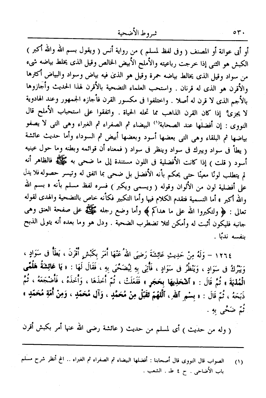 (1264) - وَلَهُ مِنْ حَدِيثِ عَائِشَةَ - رَضِيَ اللَّهُ عَنْهَا - «أَمَرَ بِكَبْشٍ أَقْرَنَ، يَطَأُ فِي سَوَادٍ، وَيَبْرُكُ فِي سَوَادٍ وَيَنْظُرُ فِي سَوَادٍ، فَأُتِيَ بِهِ لِيُضَحِّيَ بِهِ، فَقَالَ لَهَا: يَا عَائِشَةُ هَلُمِّي الْمُدْيَةَ ثُمَّ قَالَ: أَشْحِذِيهَا بِحَجَرٍ فَفَعَلَتْ، ثُمَّ أَخَذَهَا، وَأَخَذَهُ، فَأَضْجَعَهُ، ثُمَّ ذَبَحَهُ، ثُمَّ قَالَ: بِسْمِ اللَّهِ، اللَّهُمَّ تَقَبَّلْ مِنْ مُحَمَّدٍ وَآلِ مُحَمَّدٍ، وَمِنْ أُمَّةِ مُحَمَّدٍ» ثُمَّ ضَحَّى بِهِ.